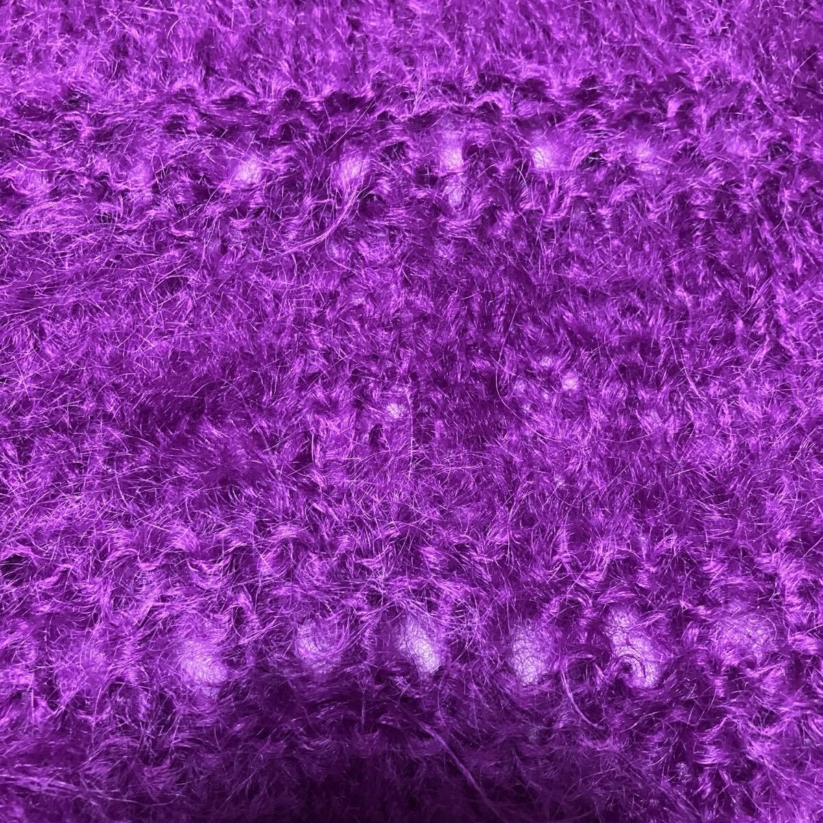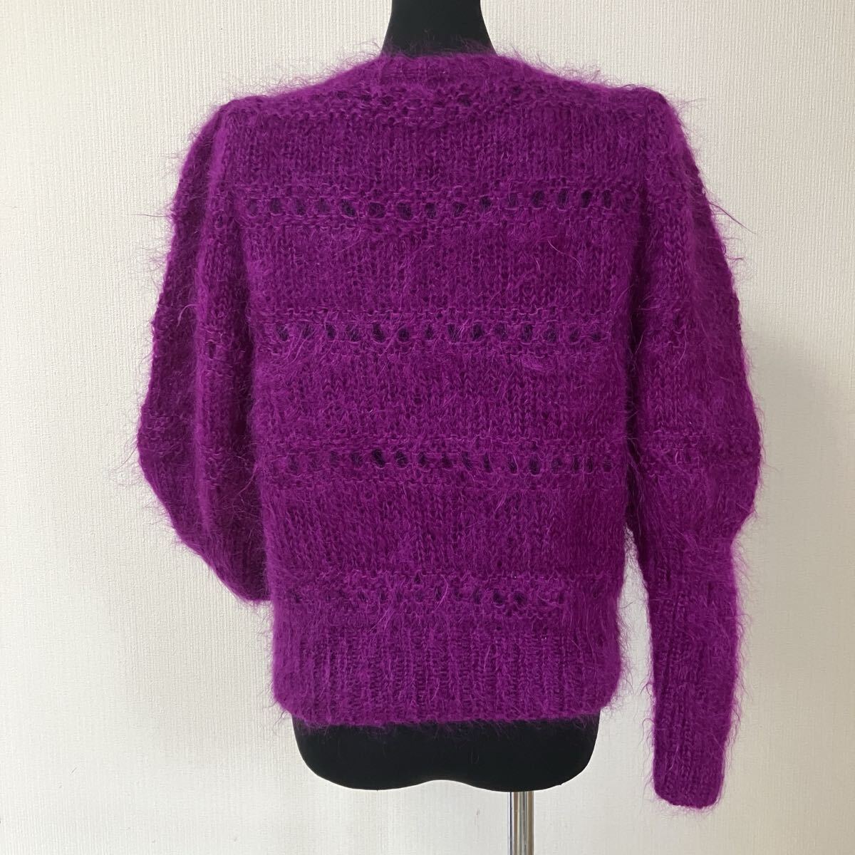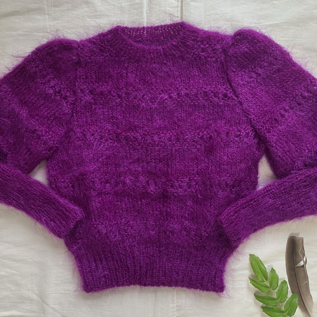 混紡のパープルニット、レース編みデザインでオーバーサイズ、パフスリーブスタイル。