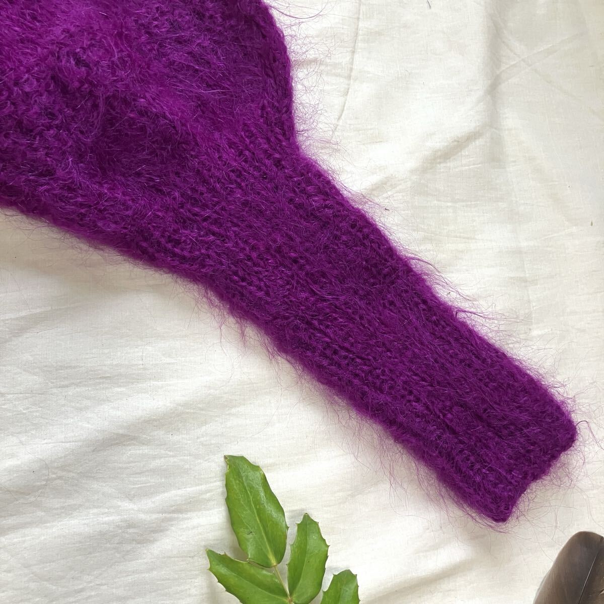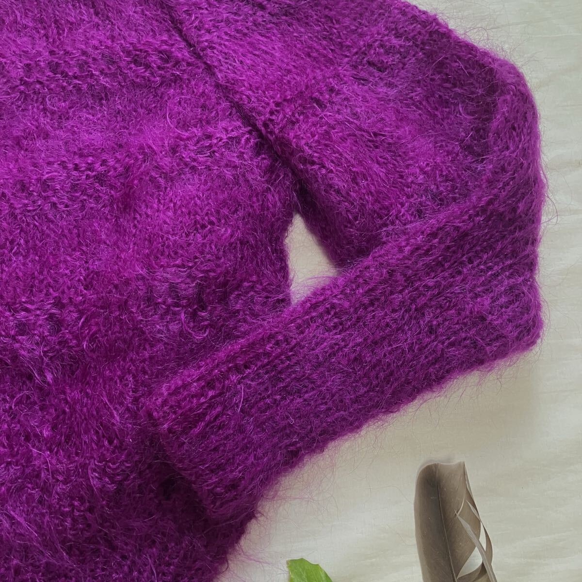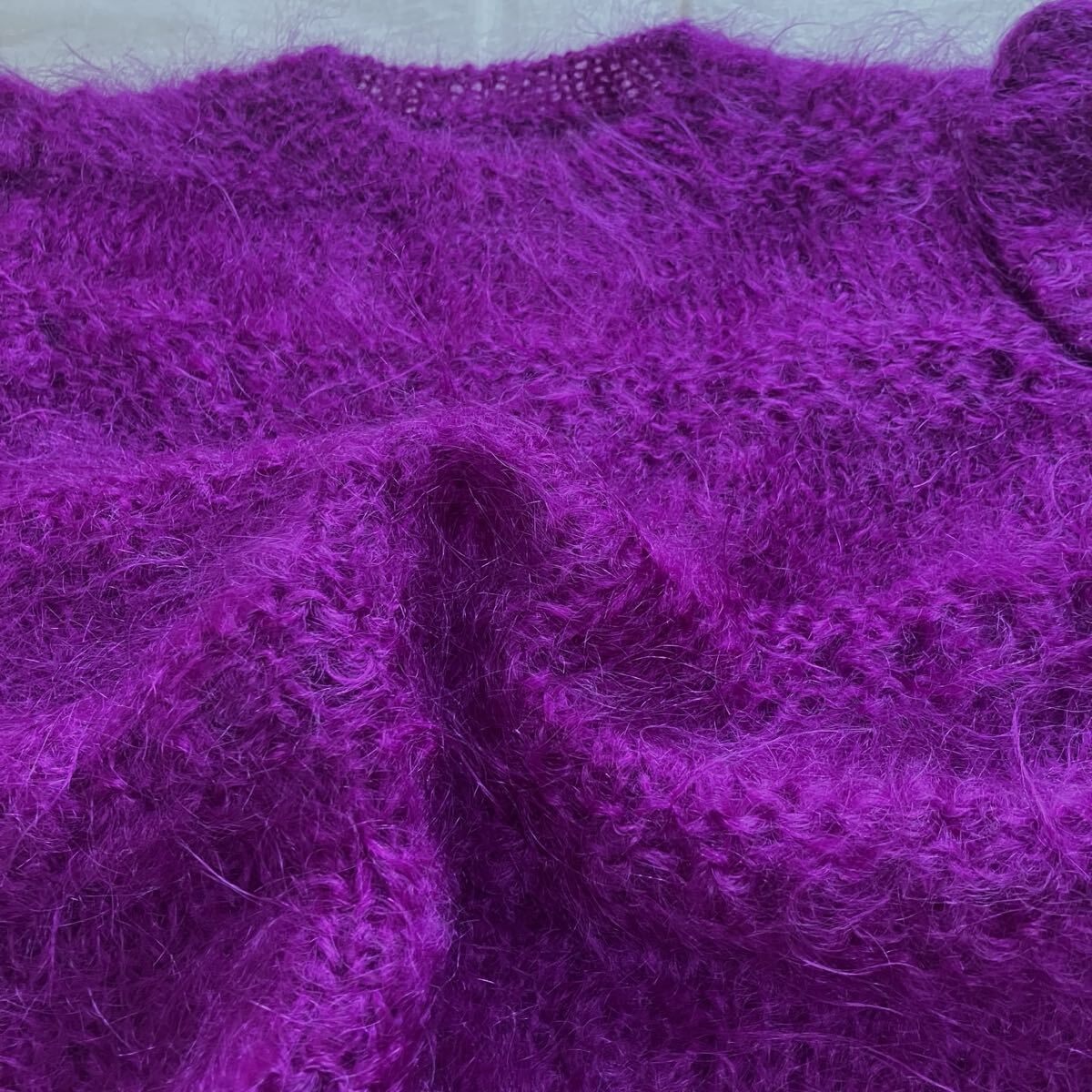 手編み・棒針編み、モヘア毛糸での、レディスセーターです。