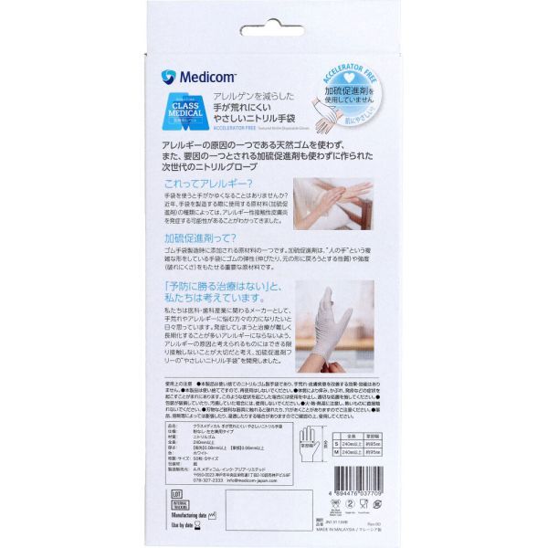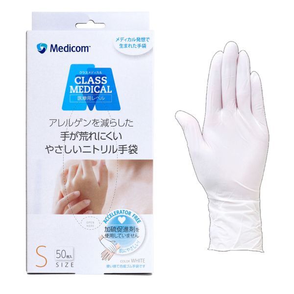 加硫促進剤を使用していませんので肌にやさしいです アレルゲンを減らした手が荒れにくいやさしいニトリル手袋 強度に優れる合成ゴムニトリルゴム製です アレルギーの原因となる加硫促進剤やラテックスプロテインやパウダー不使用で天然ゴム特有のゴム臭もありません 長時間の着用でも疲れないしなやかなグローブで食品衛生法にも準拠しています 【商品詳細】 ★Sサイズ 掌部幅:約85mm 全長:240mm以上 ※全サイズ共通 掌部厚み:0.06mm以上 ※全サイズ共通 指先厚み:0.08mm以上 ※全サイズ共通 個装サイズ:122mmX255mmX35mm 個装重量:約205g 内容量:50枚入 カラー:ホワイト 材質:ニトリルゴム 製造国:マレーシア 発売元:A.R.メディコム・インク・アジア・リミテッド JANコード:4894476037709 |