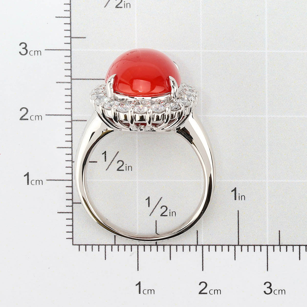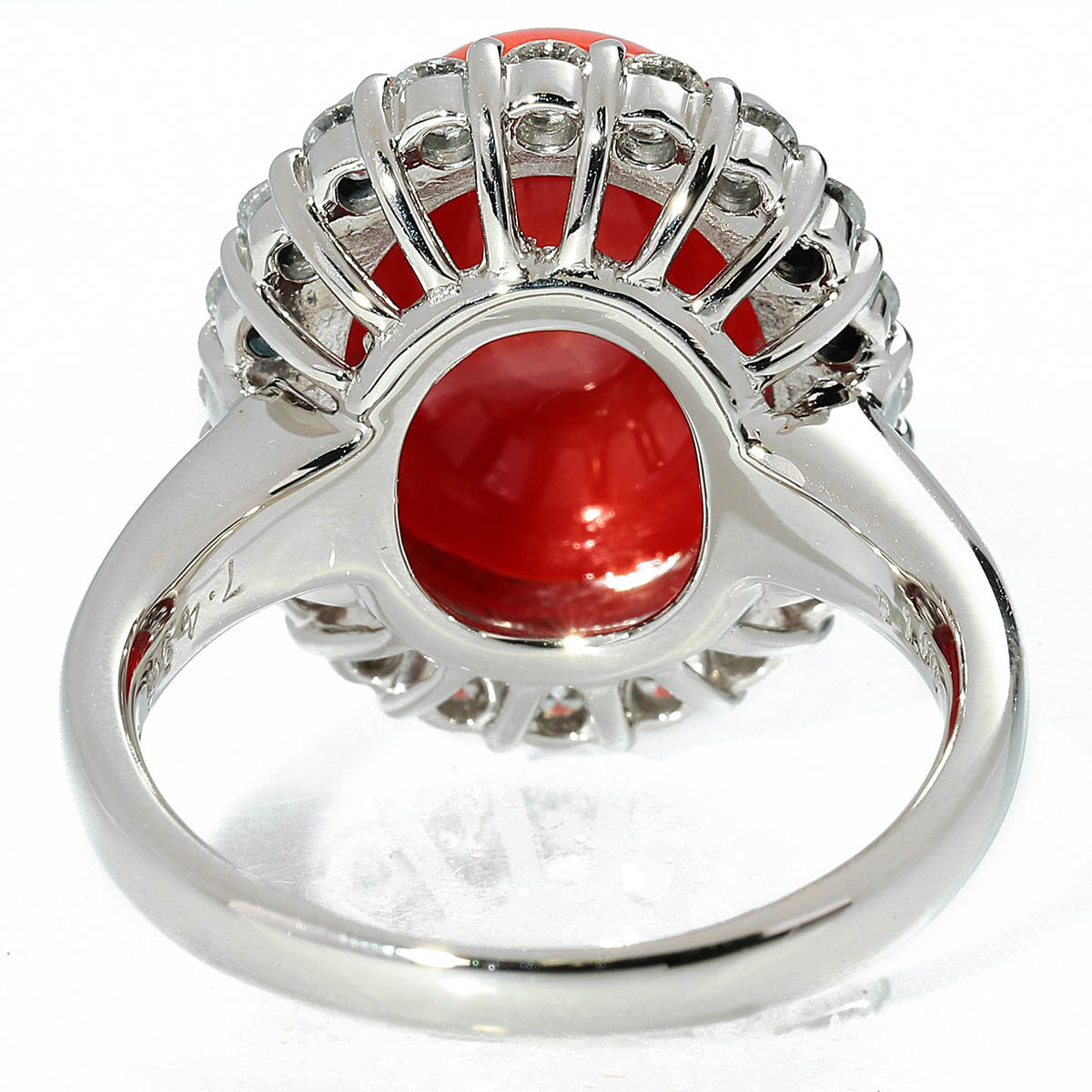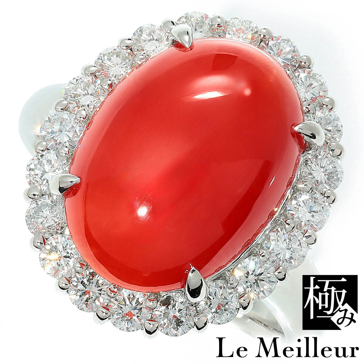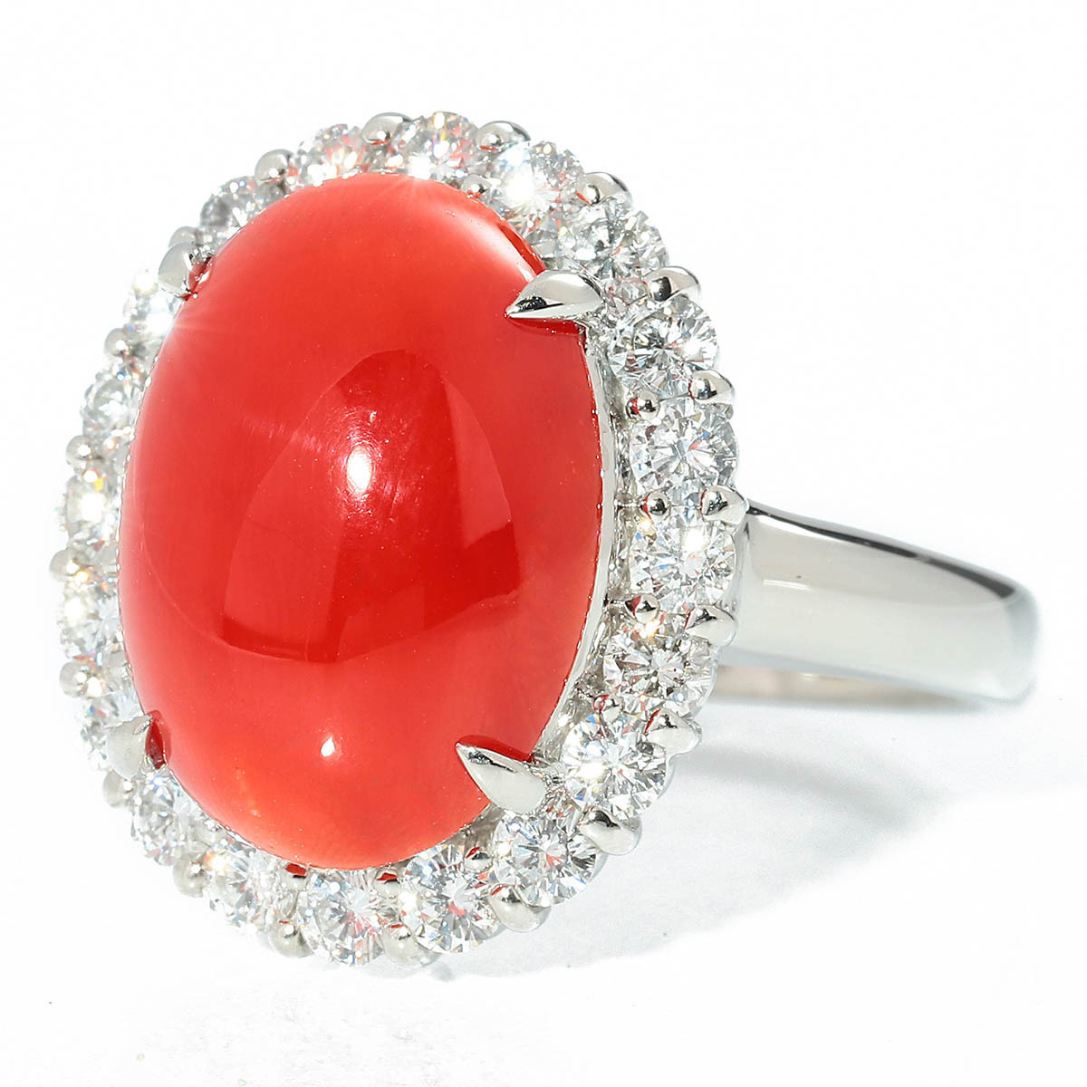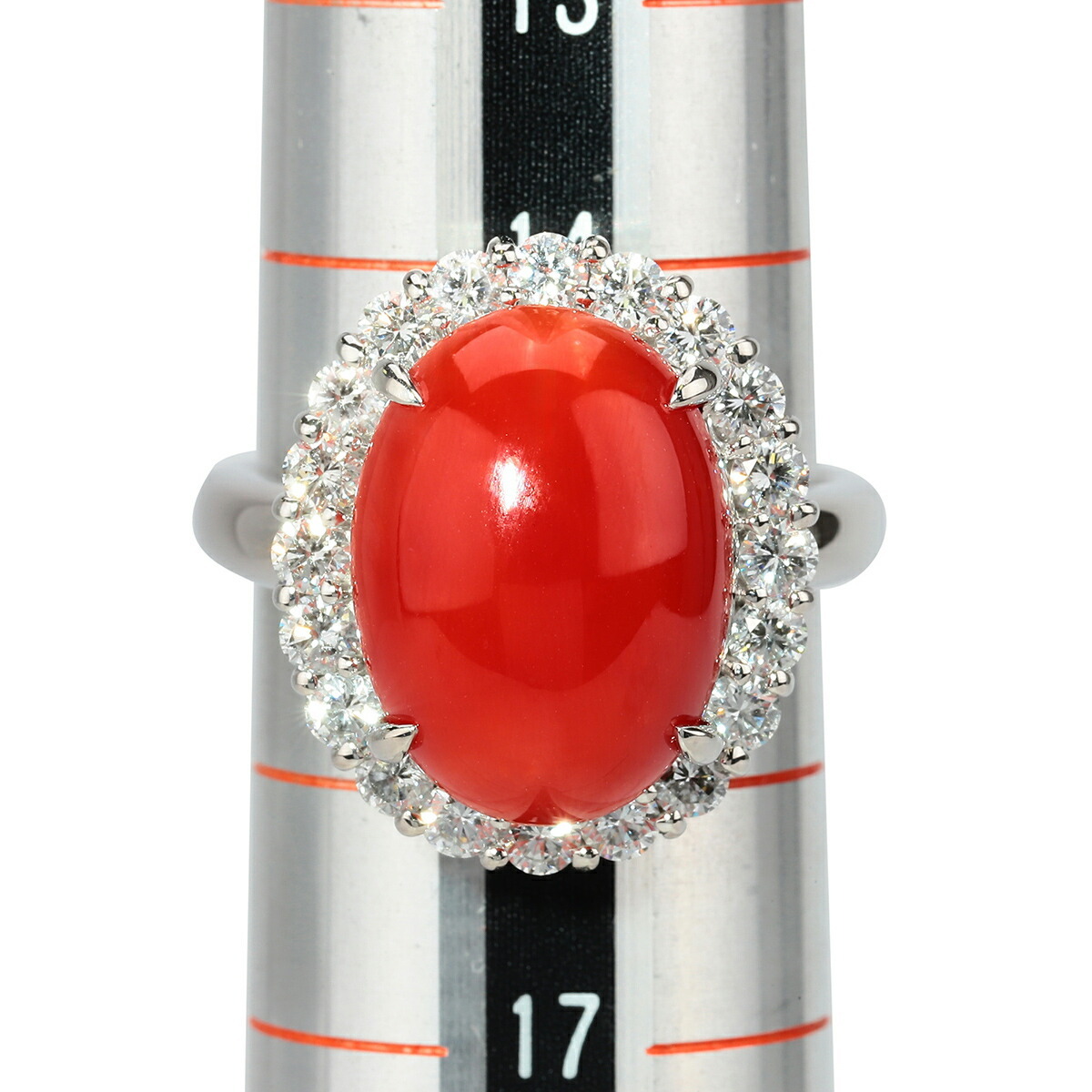 鮮やかな赤が目を奪う天然サンゴを、ダイヤモンドでぐるりと囲んだゴージャスなプラチナリング。ボリュームのあるカクテルスタイルで、指先に気品と華やぎを添えます。普段使いはもちろん、パーティーやお呼ばれシーンにも映える存在感です。