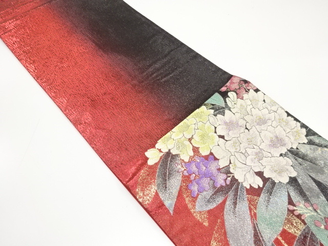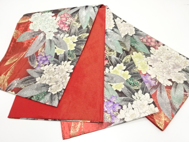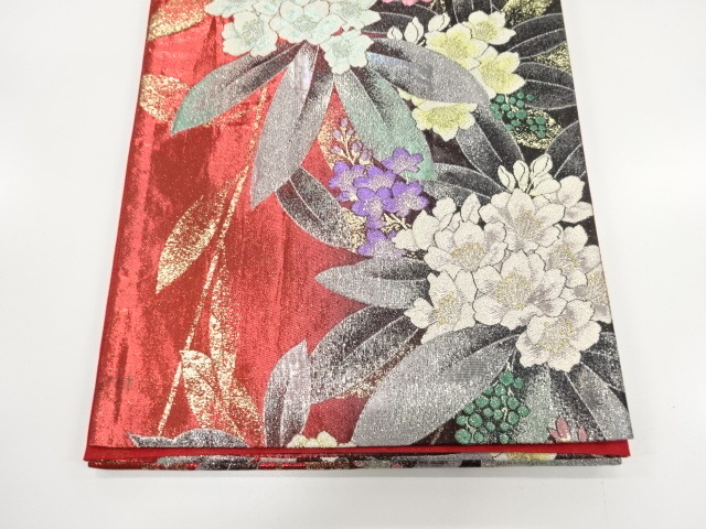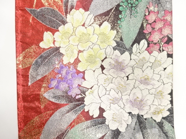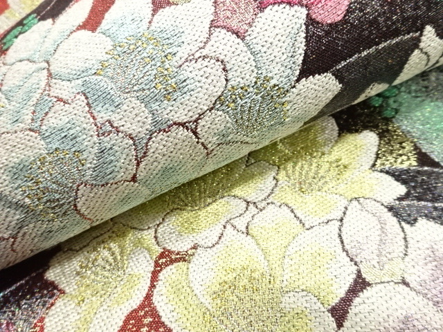 美品 洋花模様織り出し 振袖用 袋帯 (AJI1K-040)
