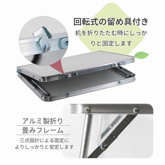 【アルミ製折り畳みフレーム】 三点設計による固定によりしっかりと安定します。 アルミ製のテーブルは、軽量かつ耐久力に優れているのが特徴。脚部にはしっかりとしたロック機能が備わっており、使用中にバランスを崩すことなく使用できます。小さいお子様と一緒に利用する場合にも安心です。