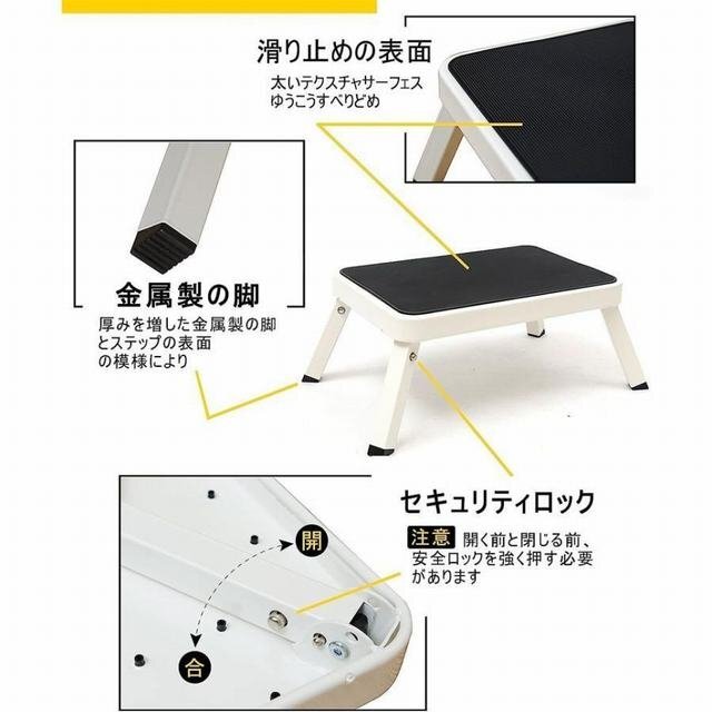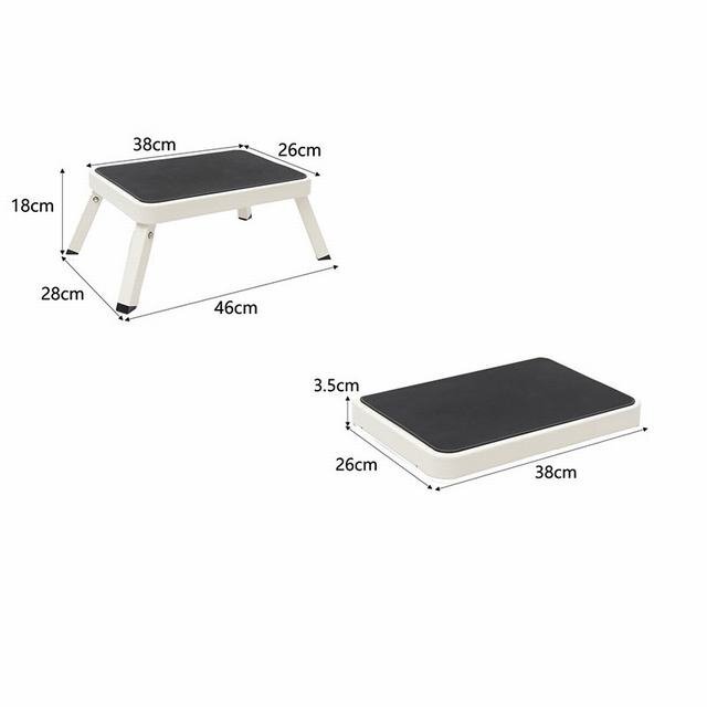 サイズ:46*28*18cm、収納サイズ:38*26*3.5cm、座面サイズ:38*26cm 安全性の向上:厚みを増した金属製の脚とステップの表面の模様により、ステップ台はより高い支持力と摩擦力を持ち、耐荷重は120kgです。グリップが床にしっかりフィット、滑り止め効果あり、ぐらつきにくく、床の傷防止にも。 折りたたみ式用の丈夫な附属品付き。 デザインアップグレード:薄型のデザインにより、折りたたんで収納した時の厚さはわずか3.5cmとなり、省スペースで、隙間に収納できる踏み台です。 バージョンアップしたステップスツールは、カラーバリエーションも豊富になりました。 利便性の向上:重量は1.96kgと軽量で、持ち運びにも便利です。 新開発のスプリングにより開閉が容易で、脚部にはロック機能付き、合金製のボタンをしっかりと押すことで、スツールを素早く折り畳むことができます。 多機能踏み台:ワイドなステップ面で、安定感があります。 玄関ステップ、車の乗り降り踏み台、トイレ踏み台、オフィスデスクやソファーの足置き、観葉植物置き台など様々なところでも
