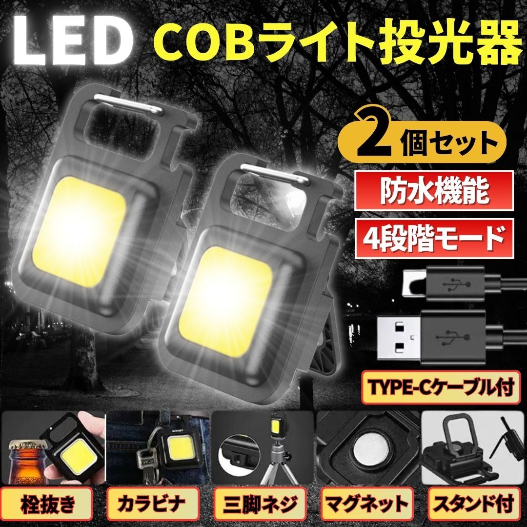 LED COB ライト ミニ投光器 2個 作業灯 小型 軽量 懐中電灯 ワークライト 照明 高輝度 マグネット USB充電ケーブル付 防水 キーホルダー カラビナ スタンド付 アウトドア キャンプ ランタン 屋外 屋内