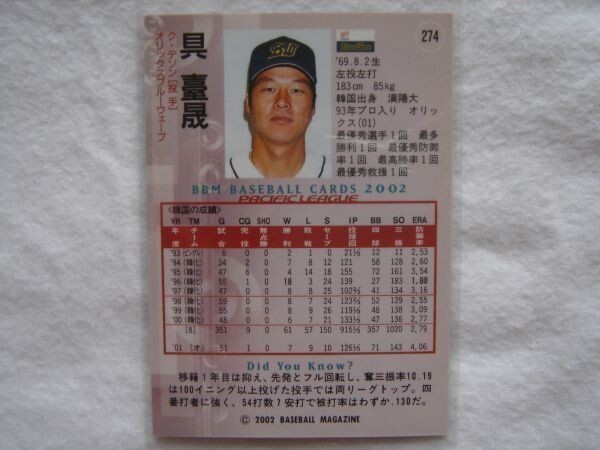 【BBM プロ野球カード 2002】No.274 具臺晟 オリックスブルーウェーブ【トレーディングカード トレカ ベースボールマガジン社】