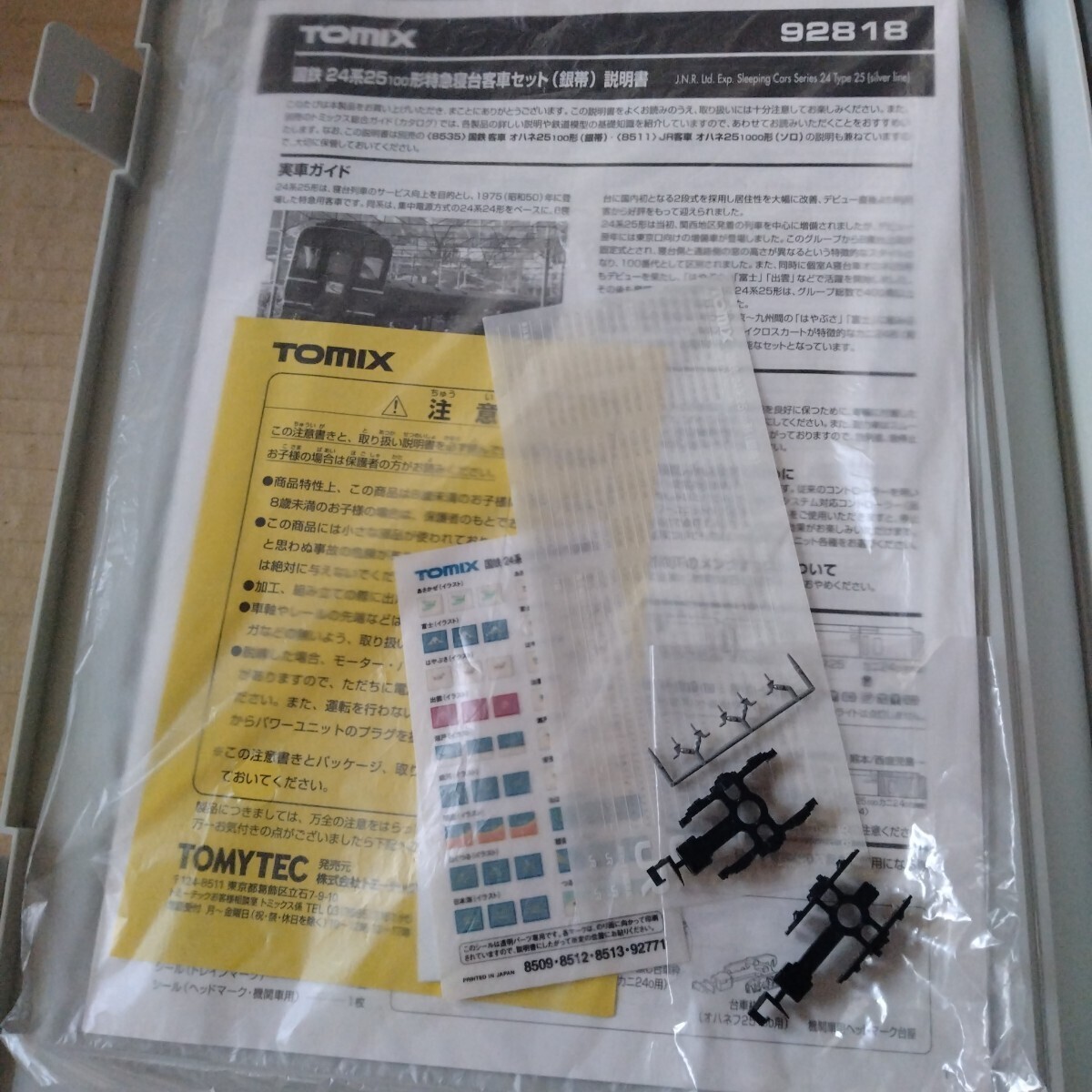 付属品は説明書、未使用シール(92771用で代用)・インレタ、カニとオハネフの交換用台車枠各1、電話アンテナパーツ(取付治具は無し)、以上のみです。