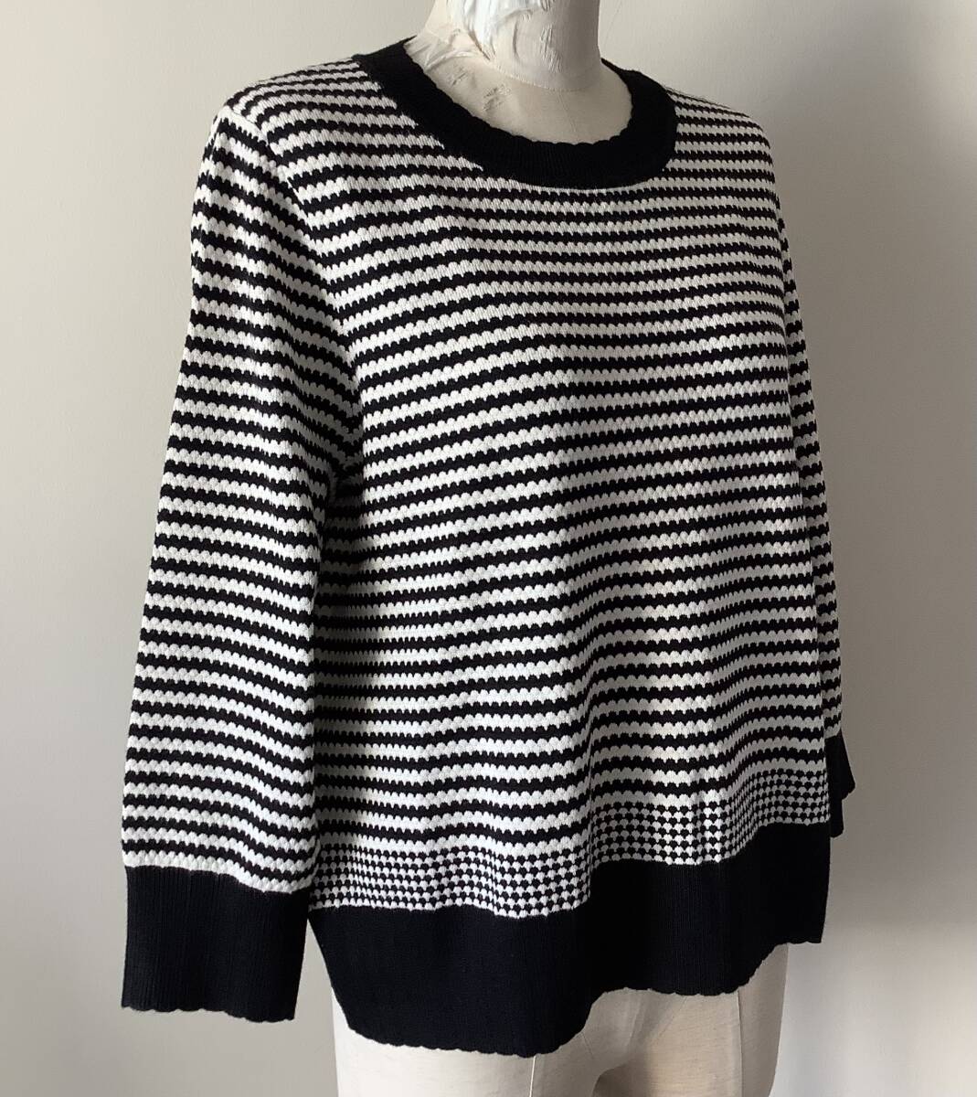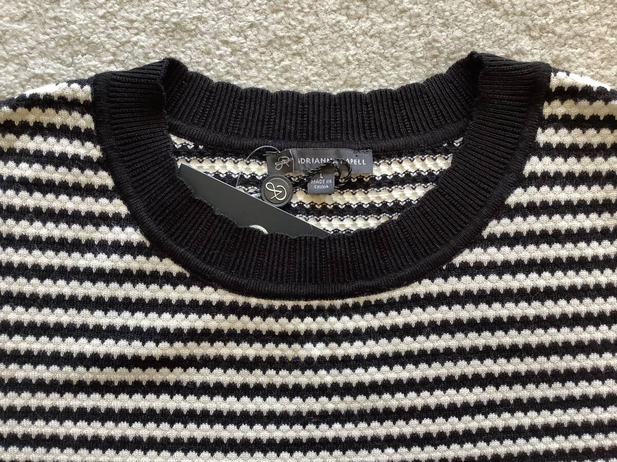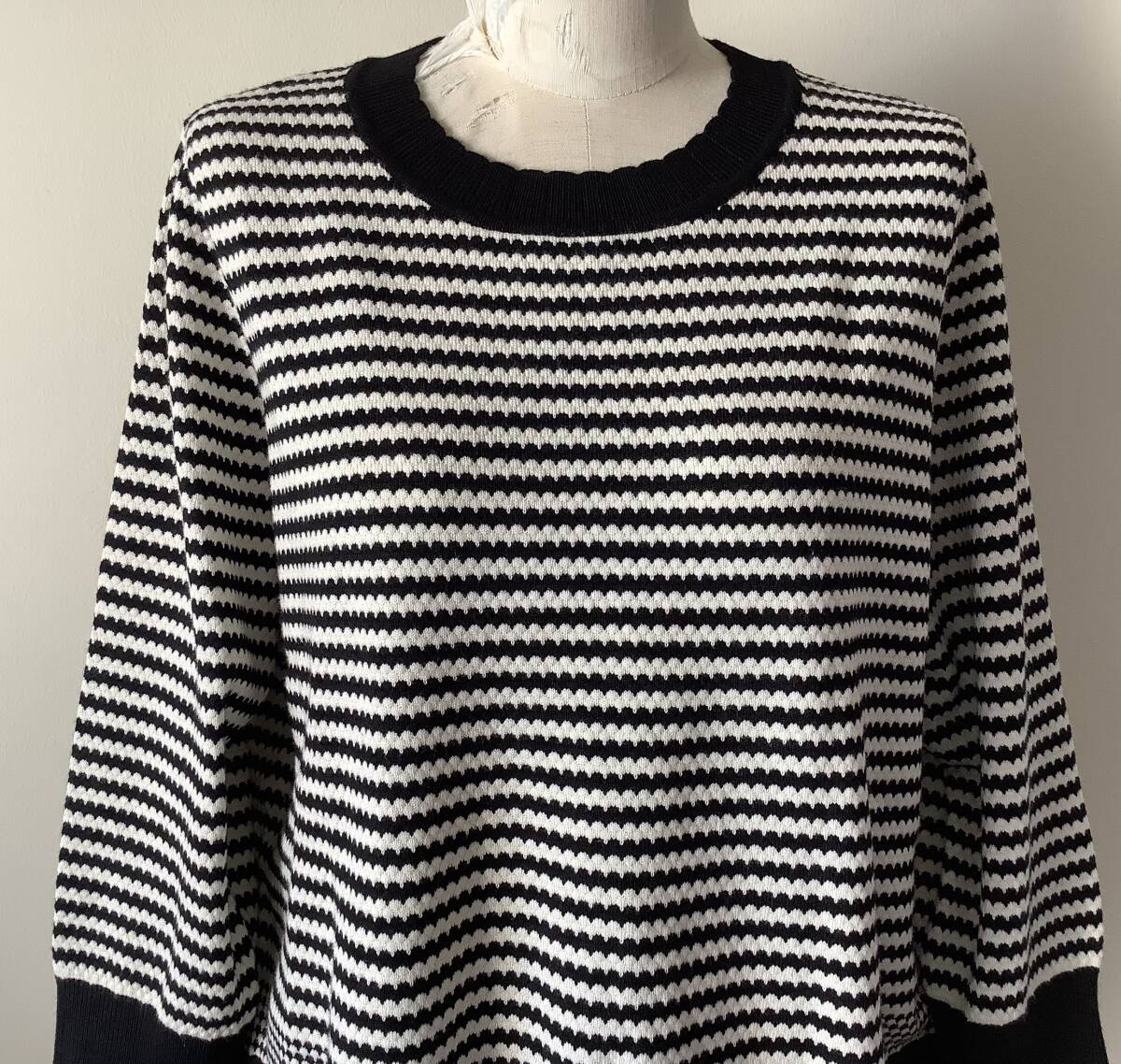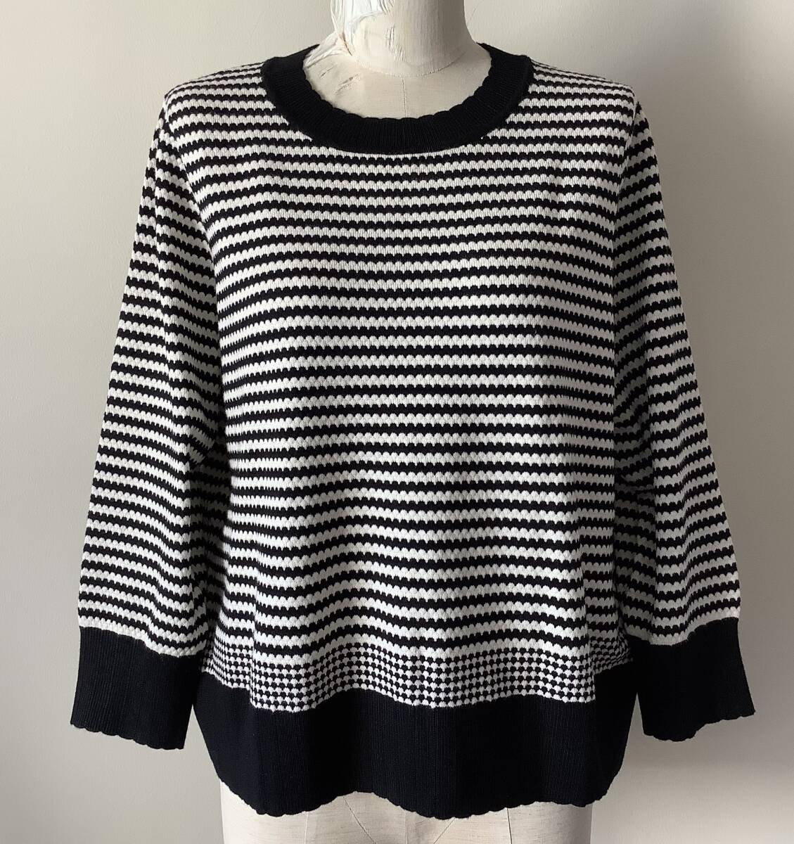 ADRIANNA PAPELLアドリアナパペル新品XL♪黒/クリーム色クルーネック波々スカラップストライプニットセーター