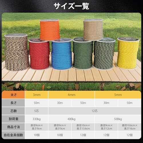 【幅広く対応】キャンプロープ・アウトドアコードとして色々な形で用いられます:テント 紐、タープ紐、オーニング ロープ、シェード ロープ、サバイバル・ハイキング・狩り・魚釣りなどのアウトドア活動、ハンモックやテンマクの張り綱など。日常生活においても、パラコード 物干し、靴紐、ブランコの吊紐など、物を固定したり吊り下げたりする様々なシーンにサポートしてくれるパラコード 反射です。また、DIY愛好家にもビッタリ。パラコードブレスレット、パラコード アクセサリー、パラコード ストラップ、ペットの首輪やリード、ナイフ・手斧などの道具の柄の飾りにたいして汎用性高いです。DANOFY手芸パラコードを通して、思い描くアイデアを実現させましょう。