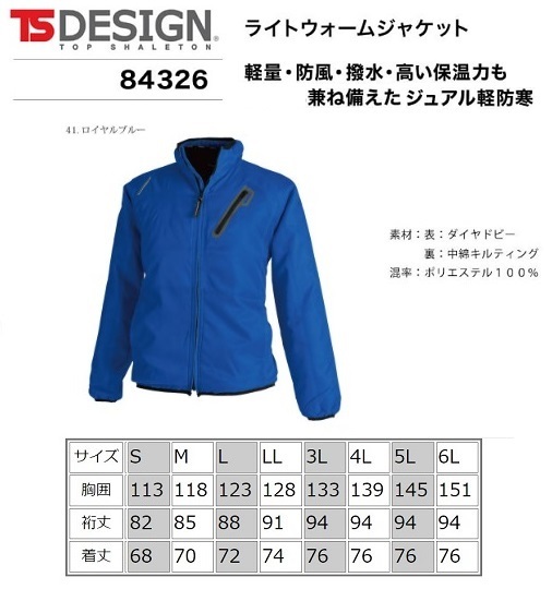 ビックイナバ特価◆TSDESIGN 84326 ライトウォームジャケット【41ロイヤルブルー・5Lサイズ】撥水・保温、定価1枚8800円の品、即決1480円