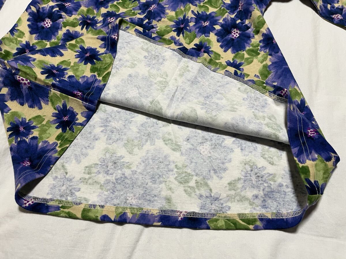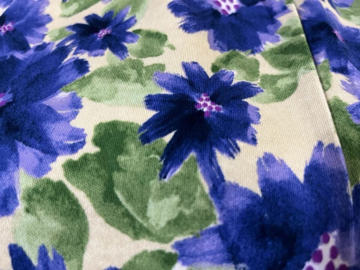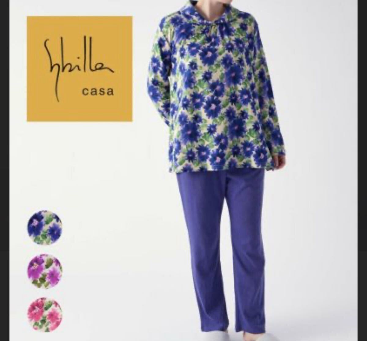 長袖長ズボンパジャマ何層にも色を重ねた水彩調の大きな花がシビラらしいプリント。30スムースに微起毛加工をしています。衿付きかぶりパジャマです。