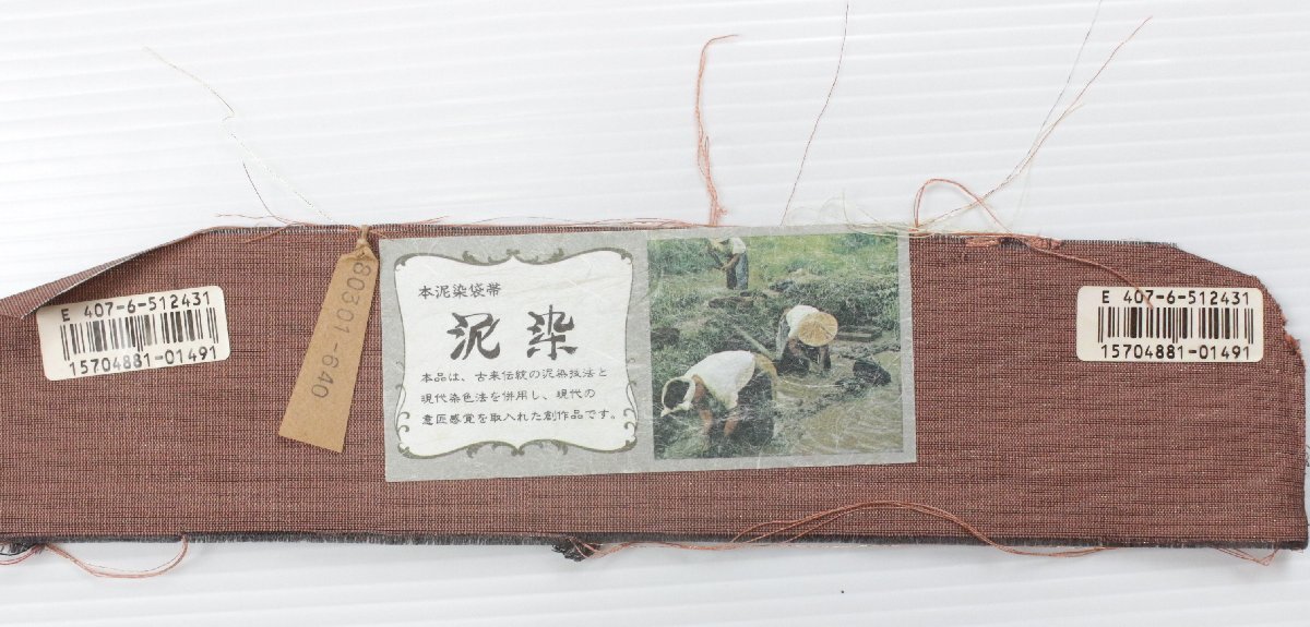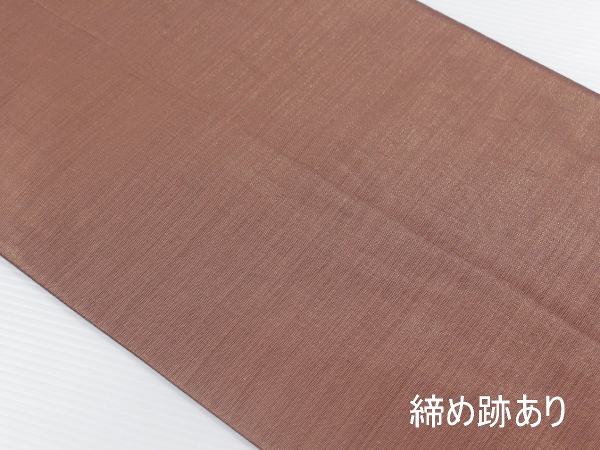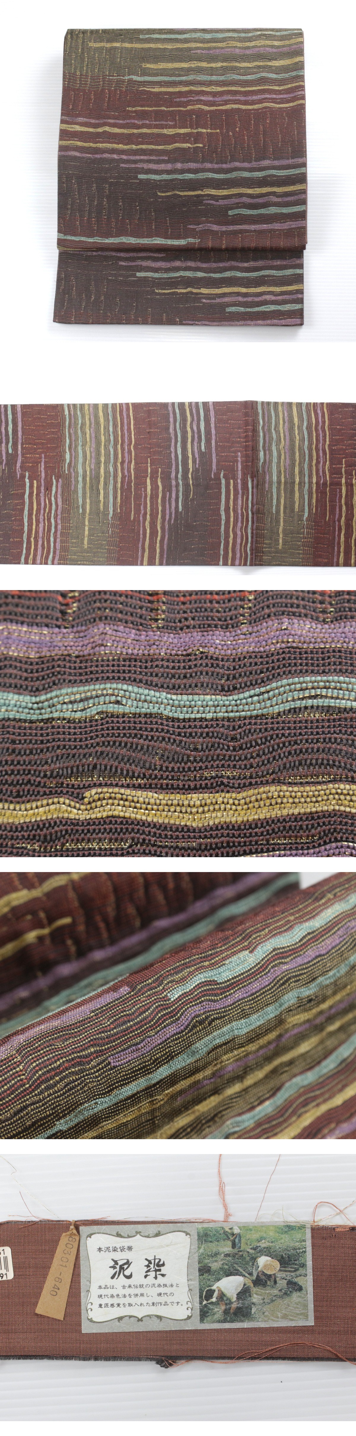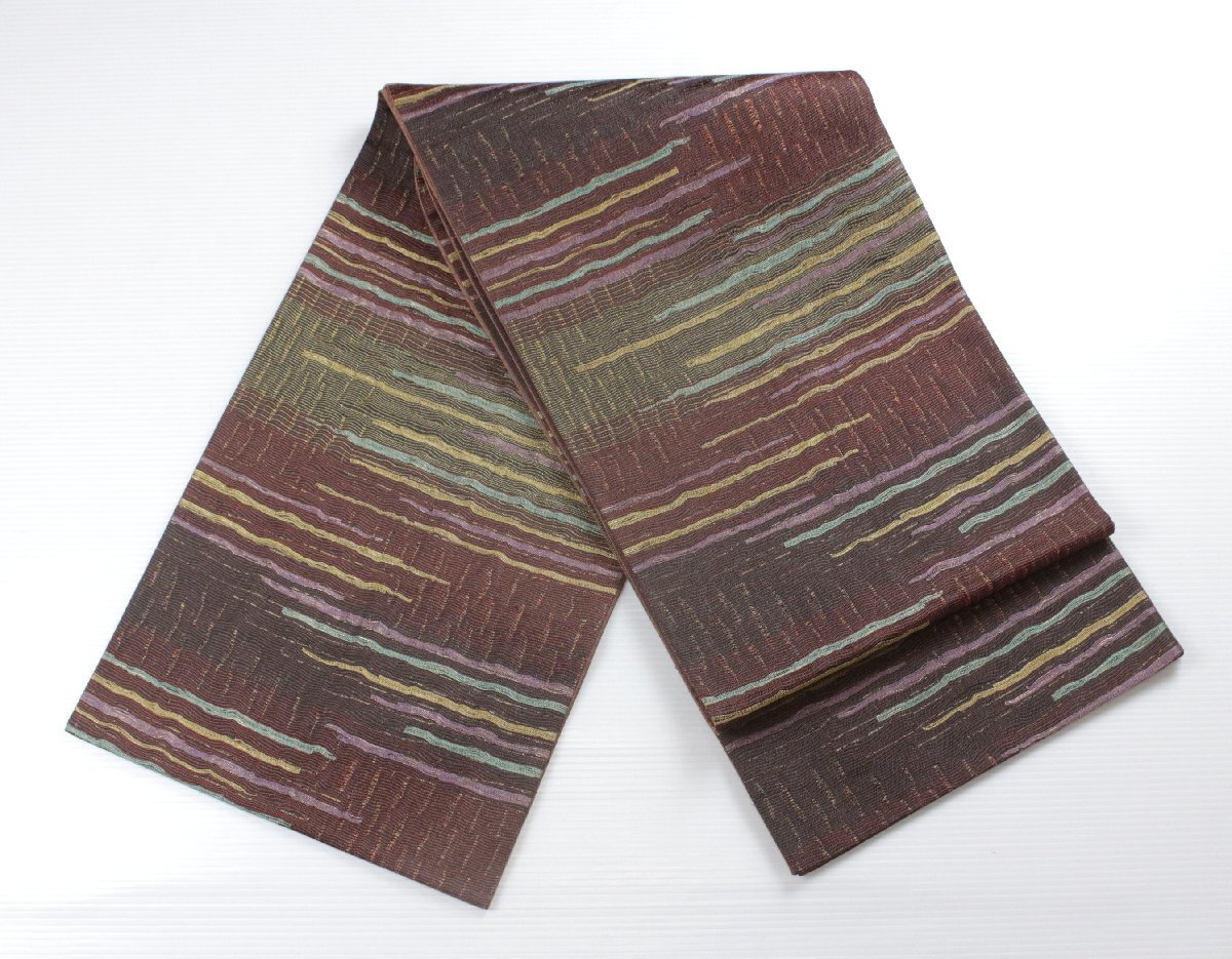 深みのある茶系の地色を基調に、本泥染ならではの落ち着いた風合いが漂う正絹袋帯のご紹介です。 泥染特有の渋みのある光沢と、自然の力を生かした独特の発色が、織り成す縞模様に表情豊かな趣きを添えています。 都会的なモダンさと伝統的な落ち着き、洗練された大人の装いを。 手仕事によって生まれる一点物の趣きがあり、年月を経るごとにしっとりとした風合いが増していくのも魅力です。 控えめでありながら個性が光る一本、お目に留まりましたら、是非ご検討下さいませ。 ※撮影時の部屋の照明によって画像の色に若干の差がございます。色味に差がございますことをご了承のうえご検討下さいませ。 …状態… 締め跡あり。 ※全くの新品ではございませんので、記載のない変色やスレ、ヤケ、その他僅かな難がある場合がございます。そのような理由でのキャンセルはお受けできませんので、ご了承の上ご検討お願いいたします。 |