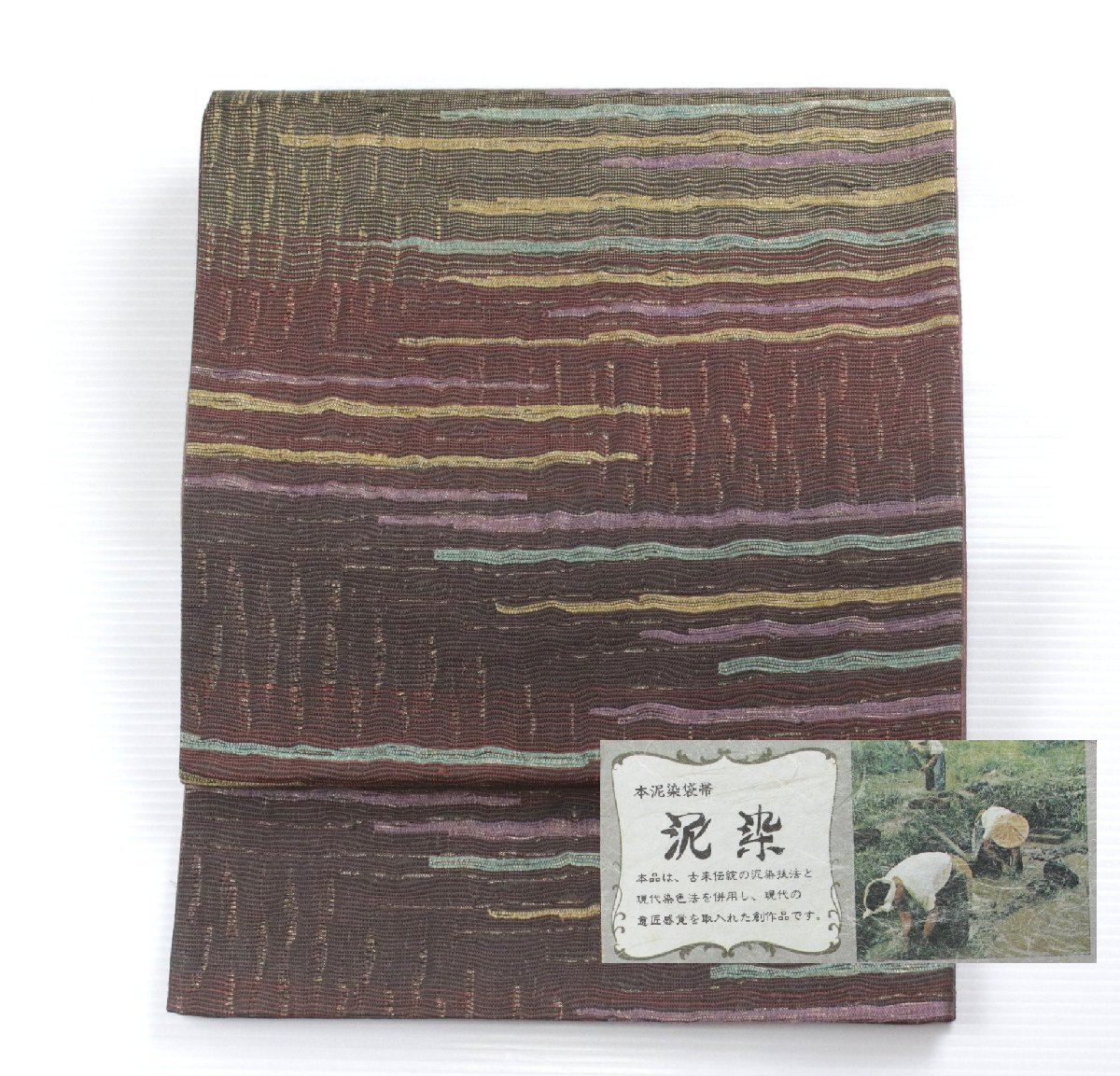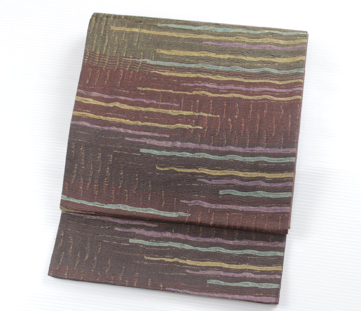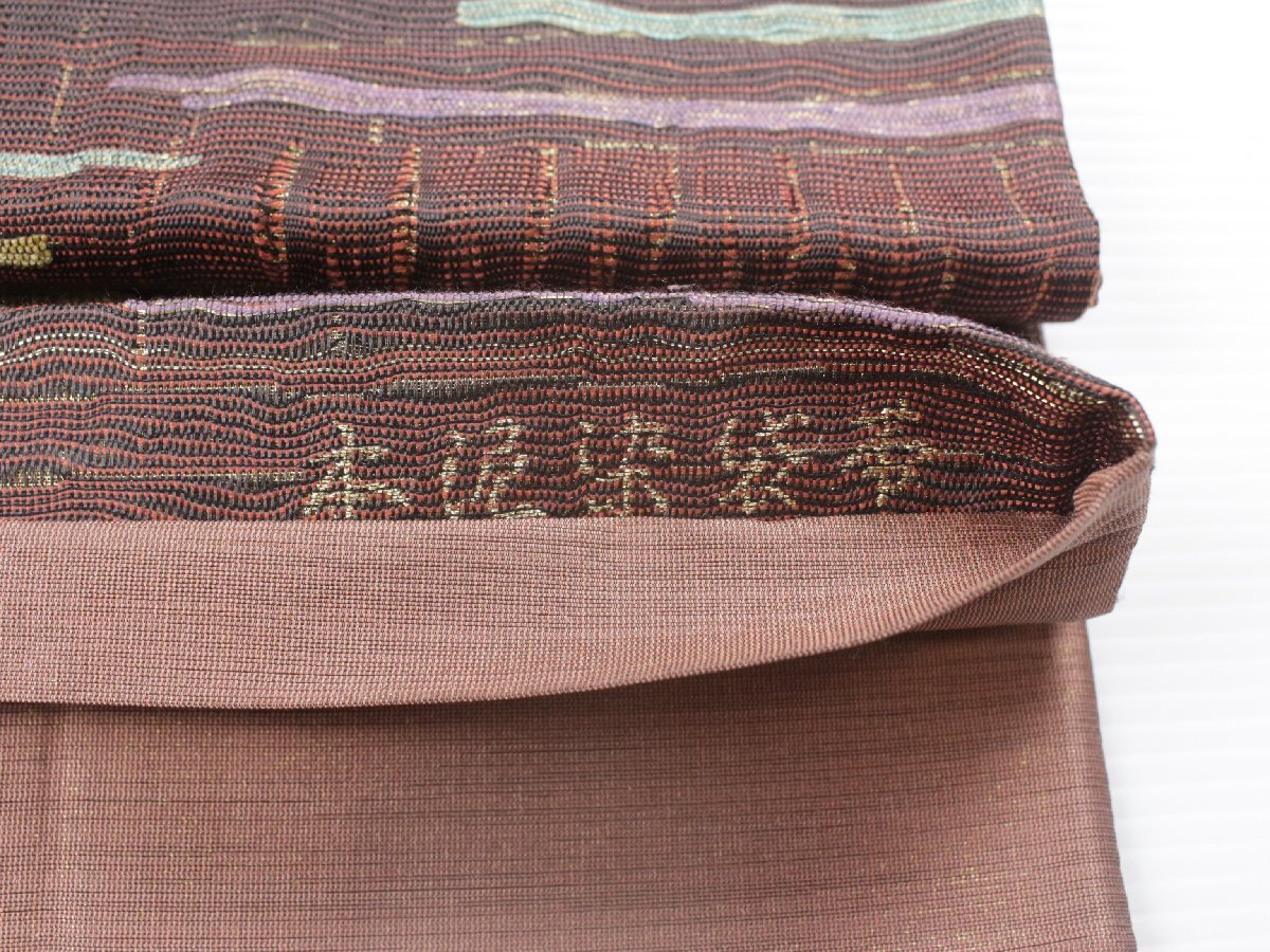 深みのある茶系の地色を基調に、本泥染ならではの落ち着いた風合いが漂う正絹袋帯のご紹介です。 泥染特有の渋みのある光沢と、自然の力を生かした独特の発色が、織り成す縞模様に表情豊かな趣きを添えています。 都会的なモダンさと伝統的な落ち着き、洗練された大人の装いを。 手仕事によって生まれる一点物の趣きがあり、年月を経るごとにしっとりとした風合いが増していくのも魅力です。 控えめでありながら個性が光る一本、お目に留まりましたら、是非ご検討下さいませ。 ※撮影時の部屋の照明によって画像の色に若干の差がございます。色味に差がございますことをご了承のうえご検討下さいませ。 …状態… 締め跡あり。 ※全くの新品ではございませんので、記載のない変色やスレ、ヤケ、その他僅かな難がある場合がございます。そのような理由でのキャンセルはお受けできませんので、ご了承の上ご検討お願いいたします。 |