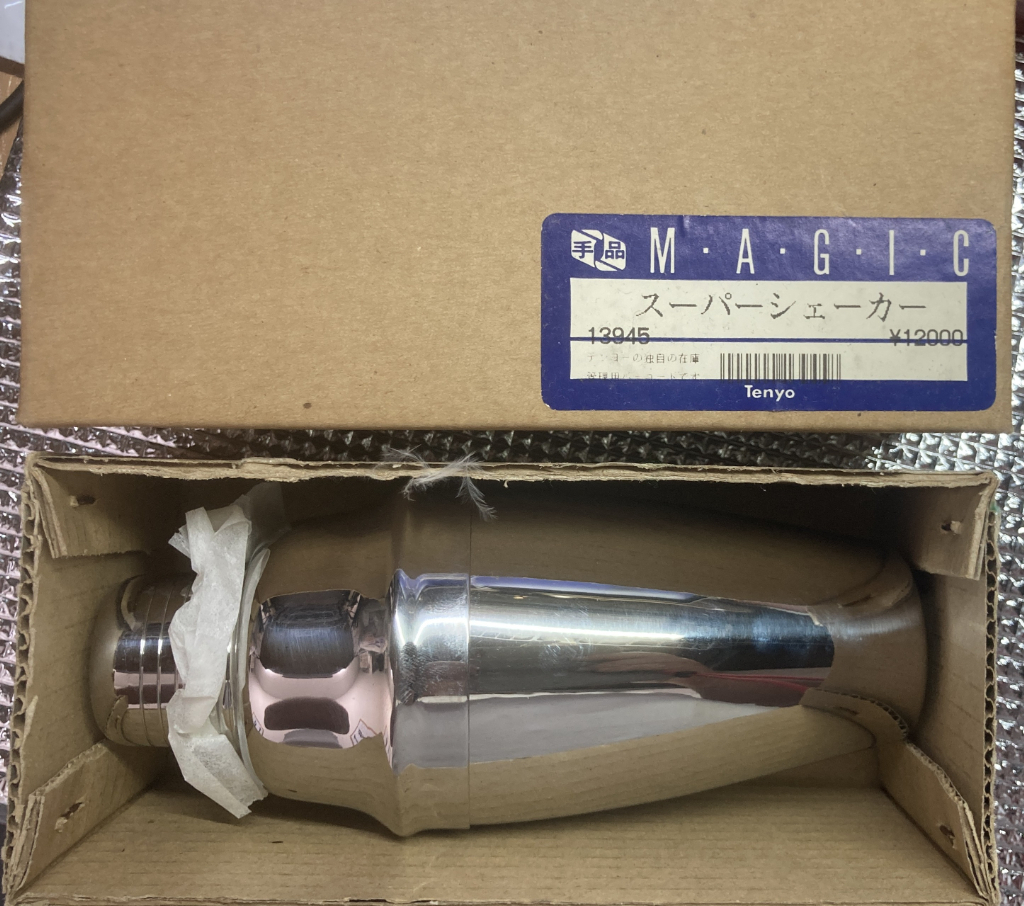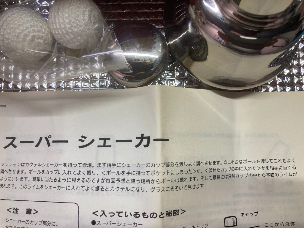 マジシャンはカクテルシェーカーを持って登場。まず相手にシェーカーのカップ部を渡しよく調べさせます