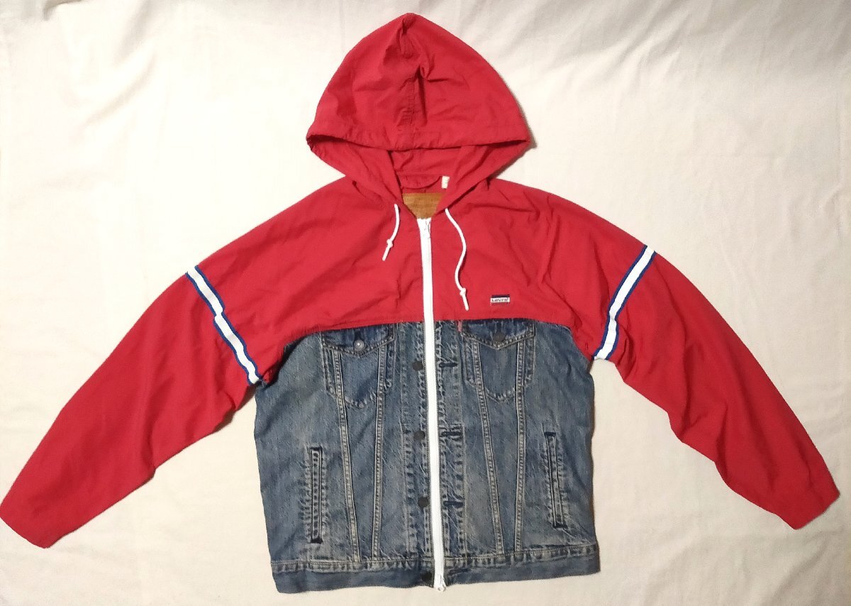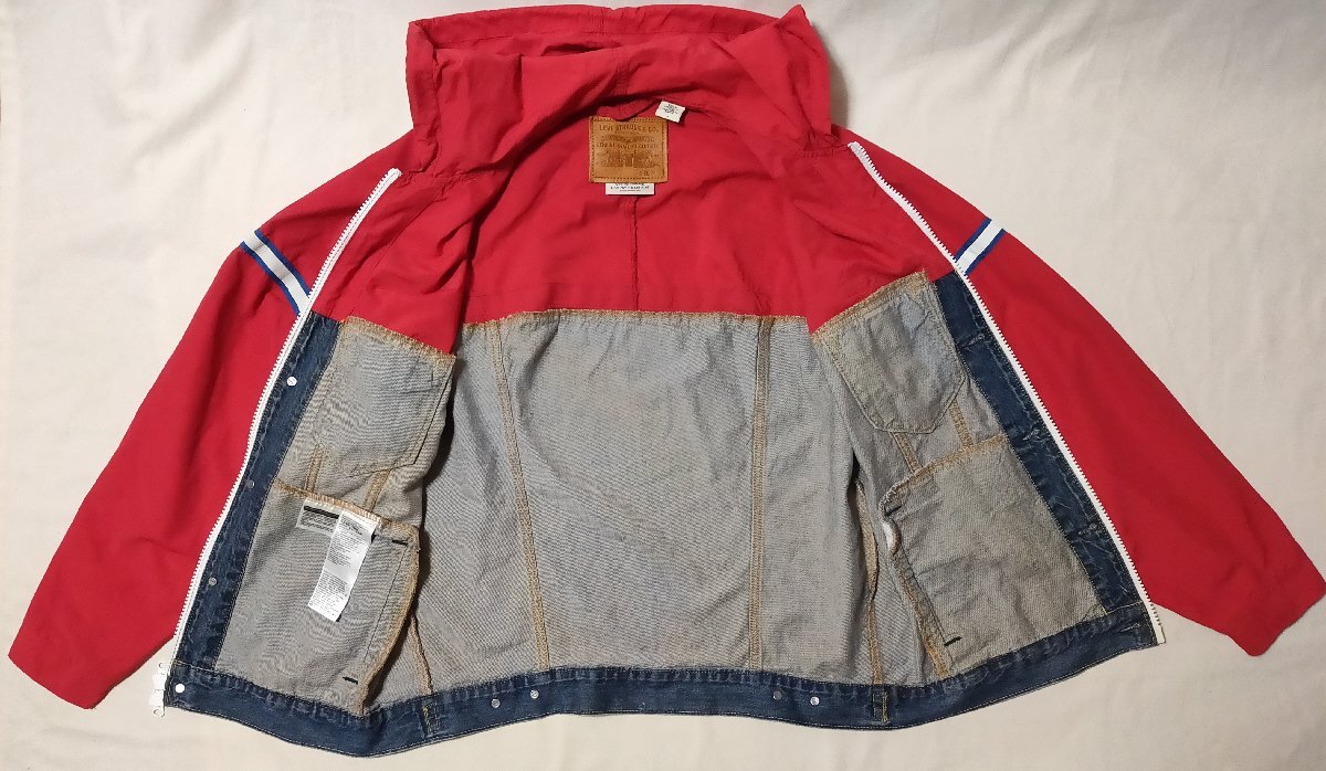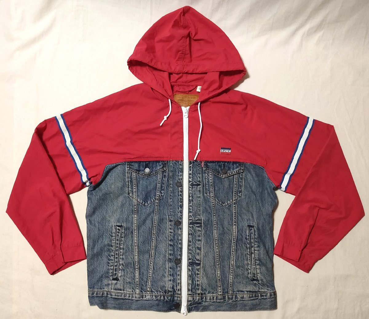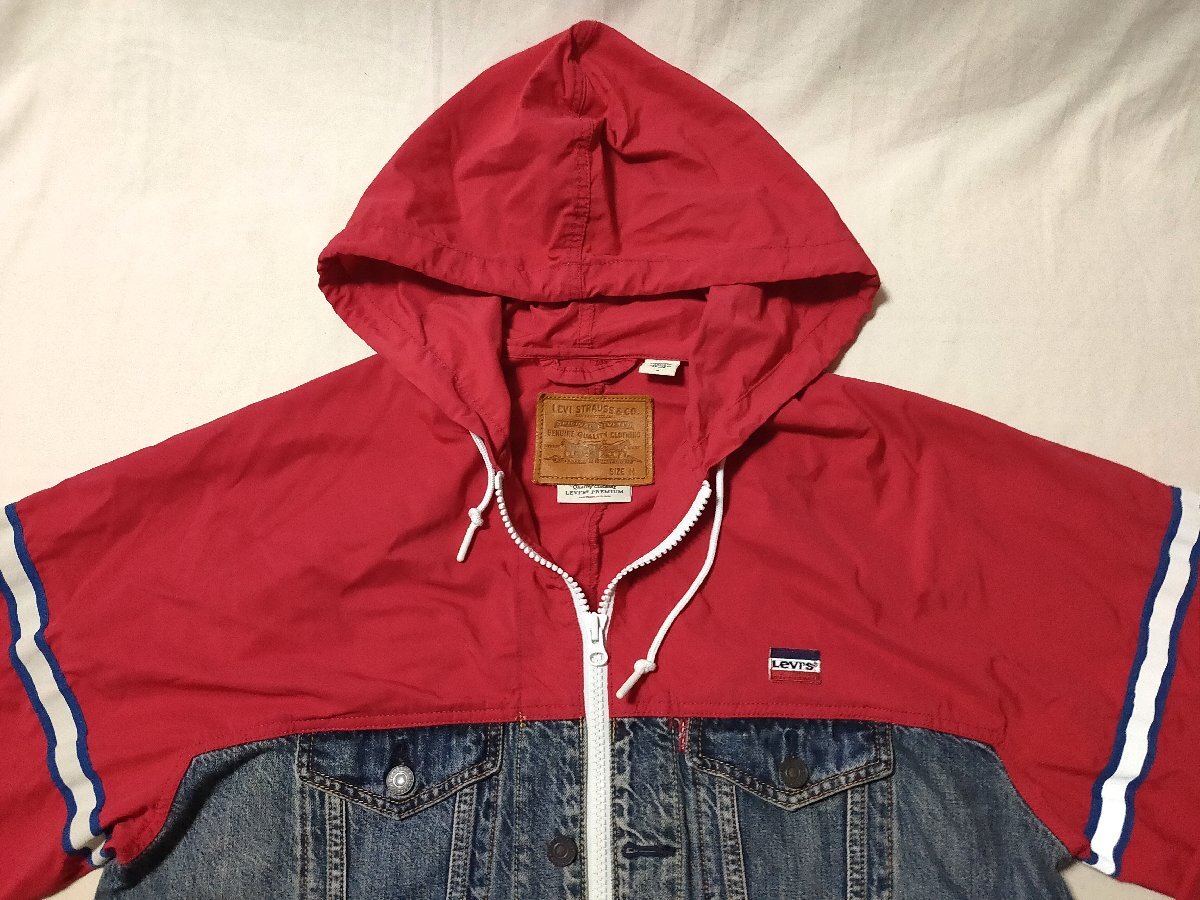 商品:★LEVI'S PREMIUM リーバイス プレミアム★ ナイロン×デニム 切り替え フード付き ジャケット sizeM レッド×インディゴ 02933