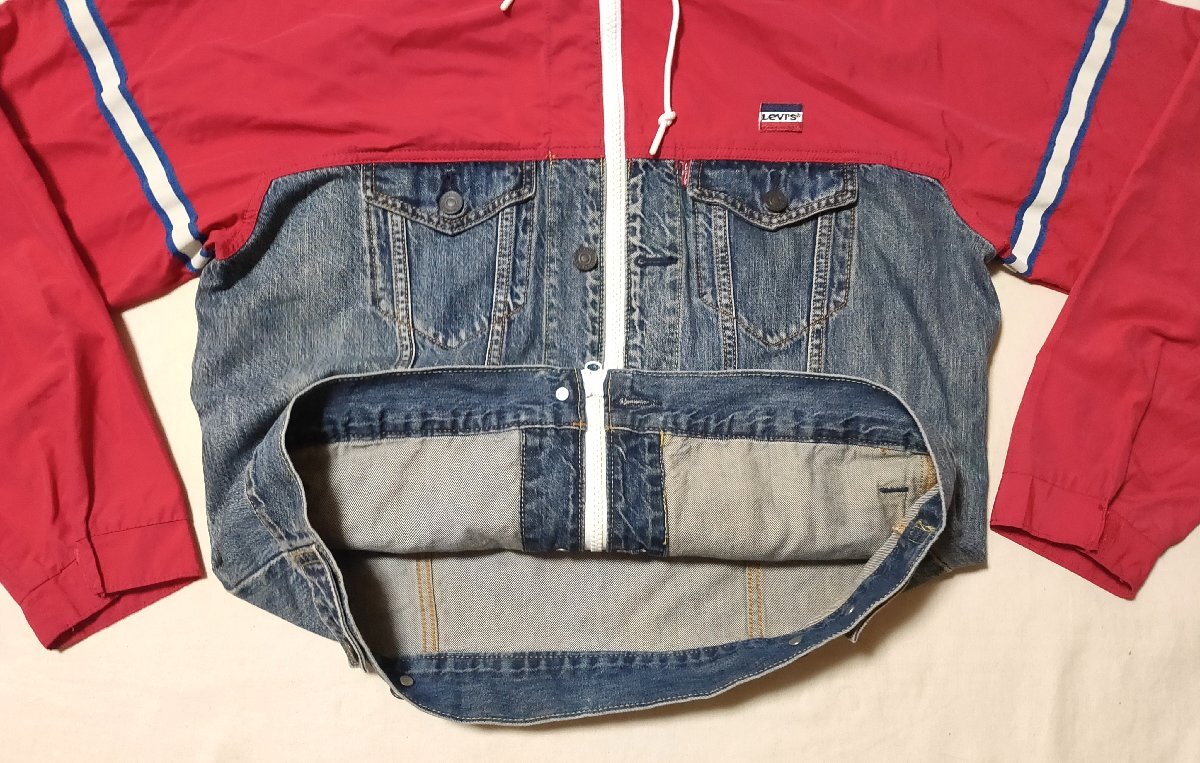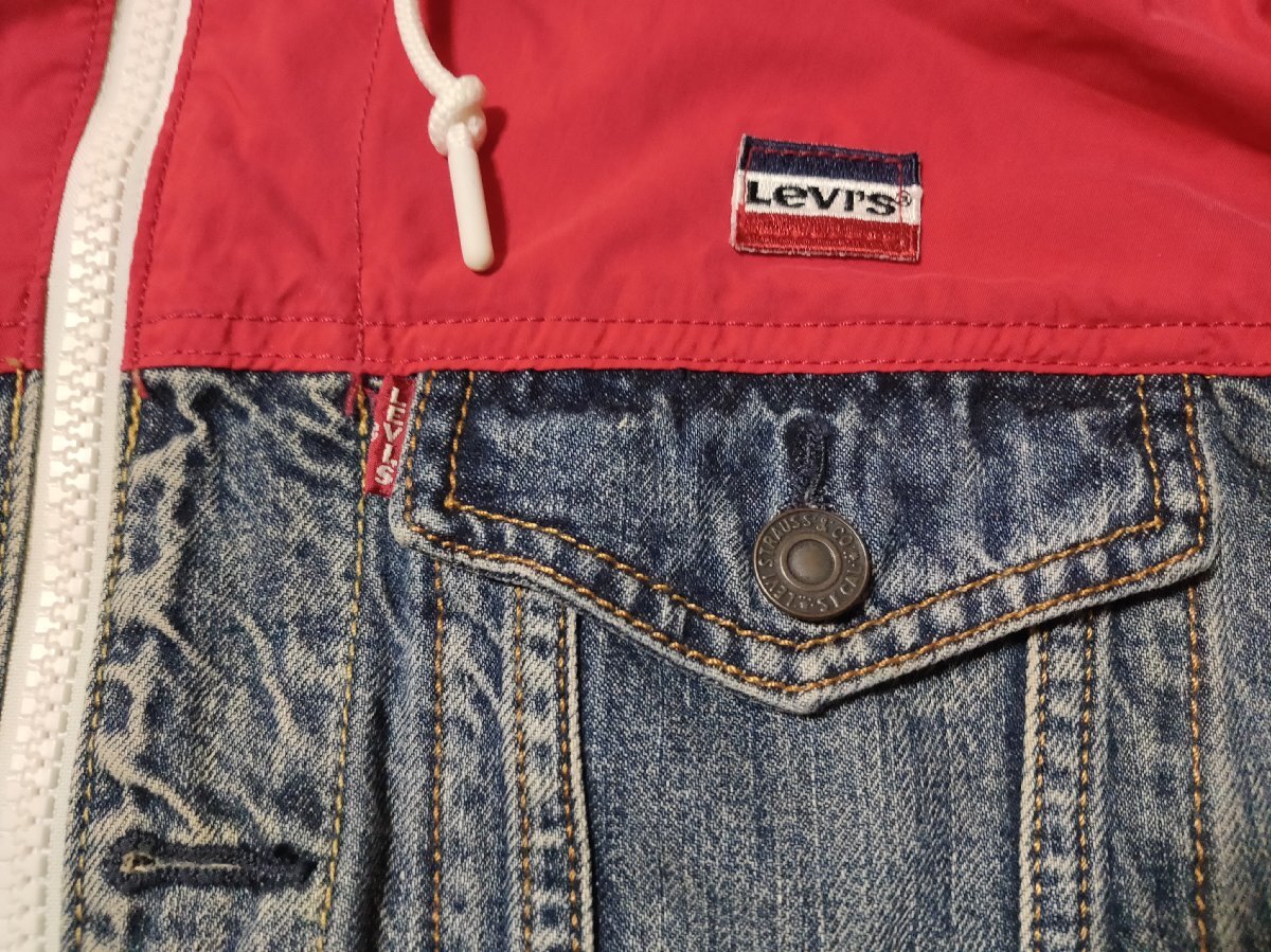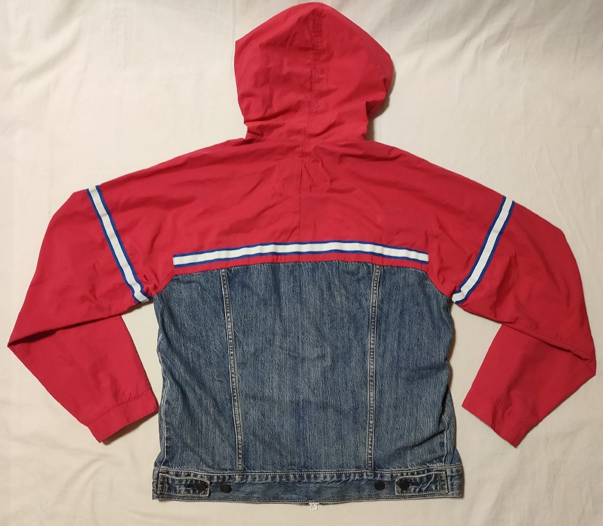 商品:★LEVI'S PREMIUM リーバイス プレミアム★ ナイロン×デニム 切り替え フード付き ジャケット sizeM レッド×インディゴ 02933