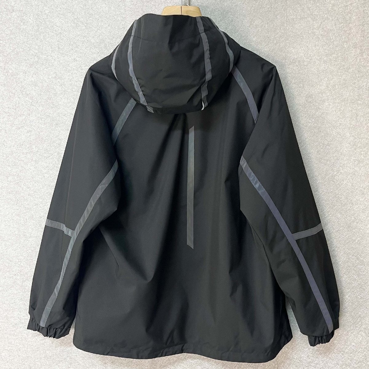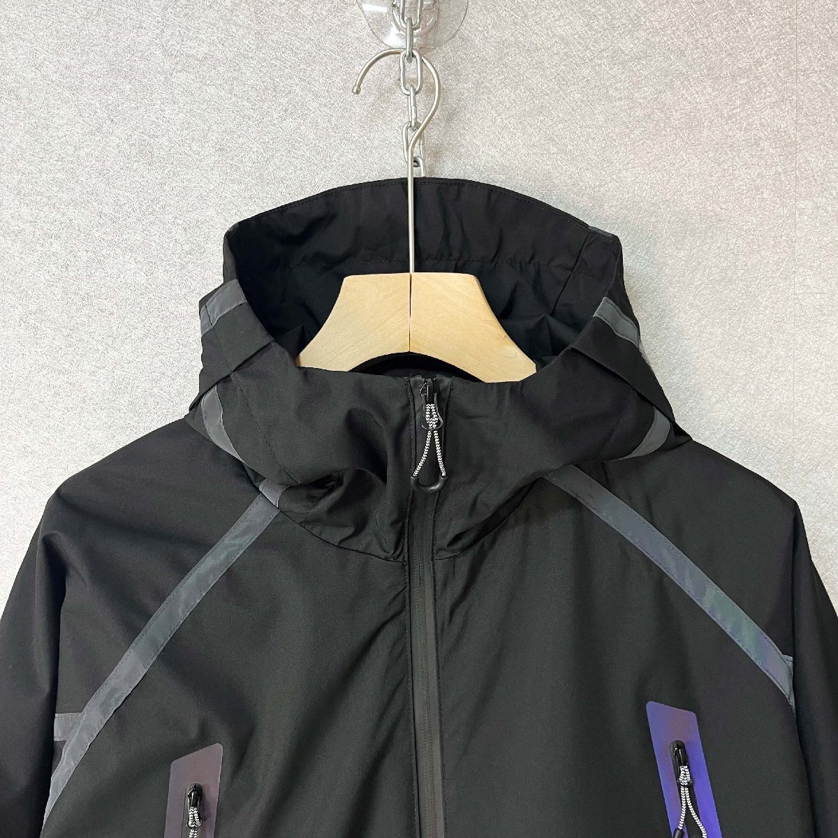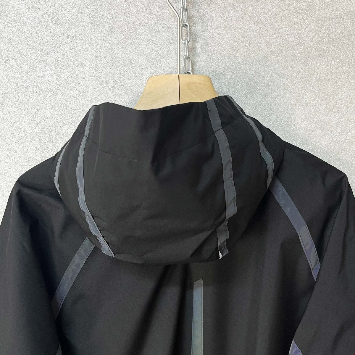 頭までしっかり覆えるフード付きのデザインで、防風性をさらにアップ。袖口はゴム入りのシャーリング仕様で、ぴったりフィットし、冷たい風の侵入をしっかり防ぎます。胸元や背中には反射材(リフレクター)を配置し、夜間の視認性を高め、安全性にも配慮しています。