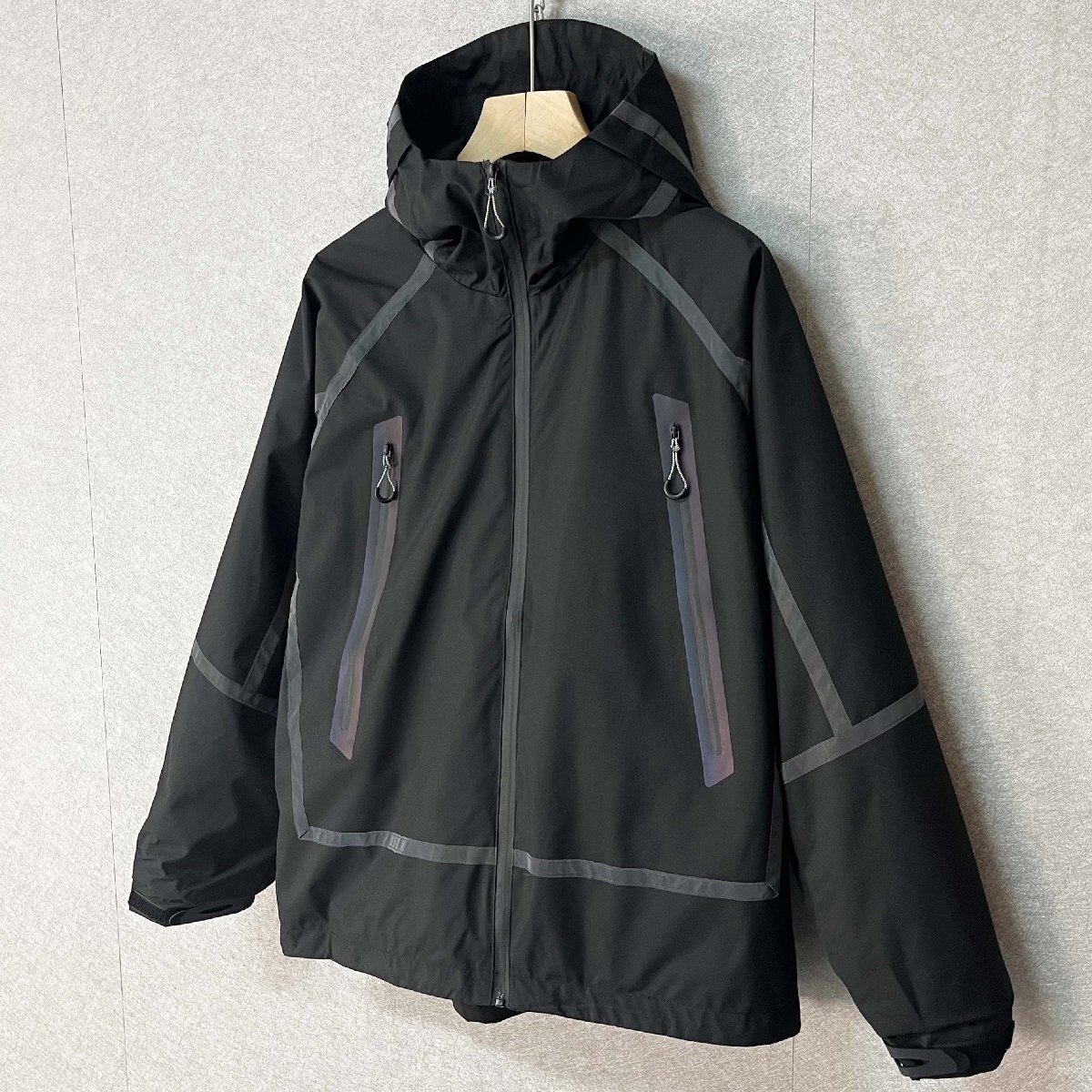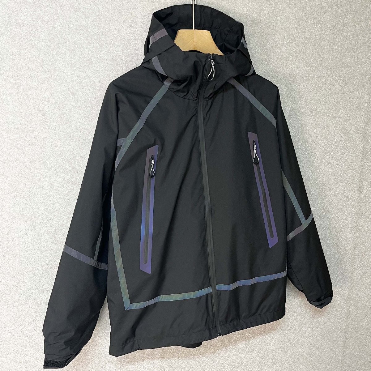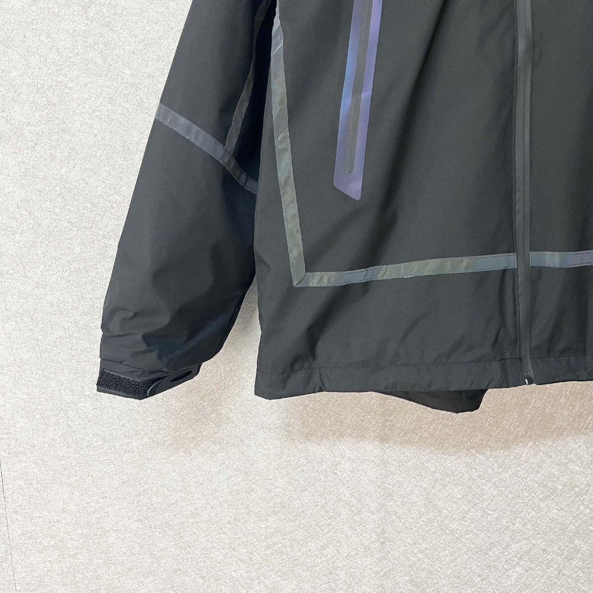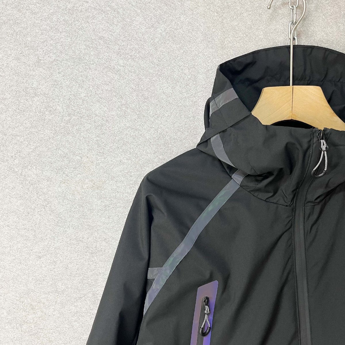 頭までしっかり覆えるフード付きのデザインで、防風性をさらにアップ。袖口はゴム入りのシャーリング仕様で、ぴったりフィットし、冷たい風の侵入をしっかり防ぎます。胸元や背中には反射材(リフレクター)を配置し、夜間の視認性を高め、安全性にも配慮しています。
