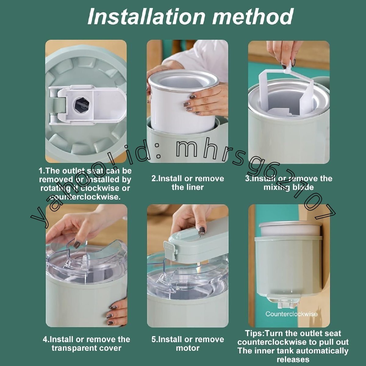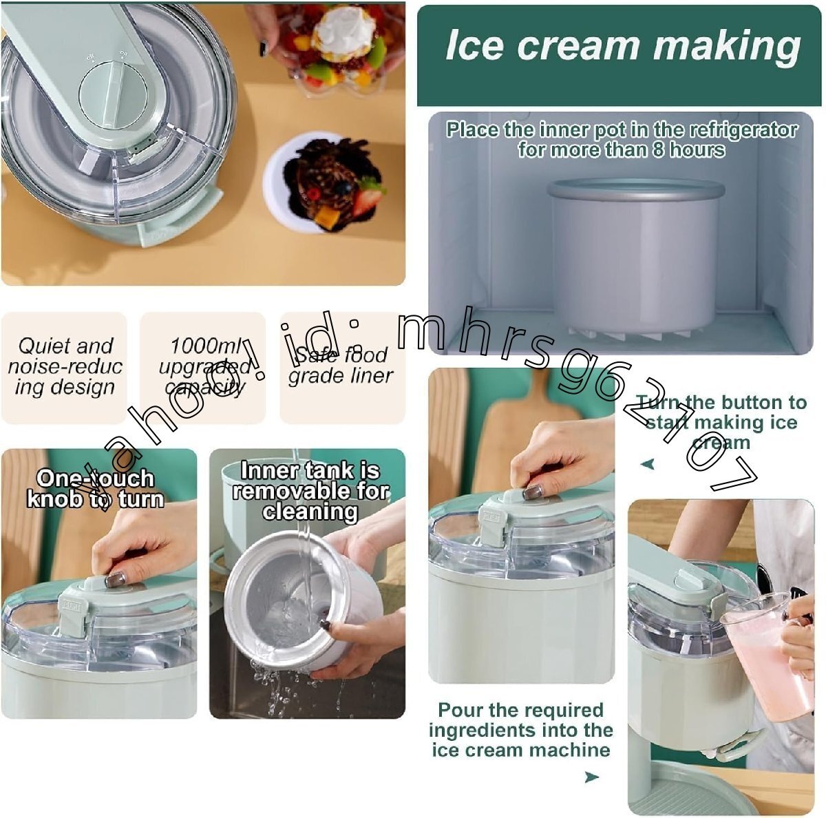 【簡単な操作】:材料を混ぜ、材料を準備し、ボウルに入れてよく混ぜます。ソフトクリームメーカーの電源を入れたら、混ぜた材料を内容器に注ぎます。約10分間かき混ぜ、スイッチを入れてアイスクリームを転がします。