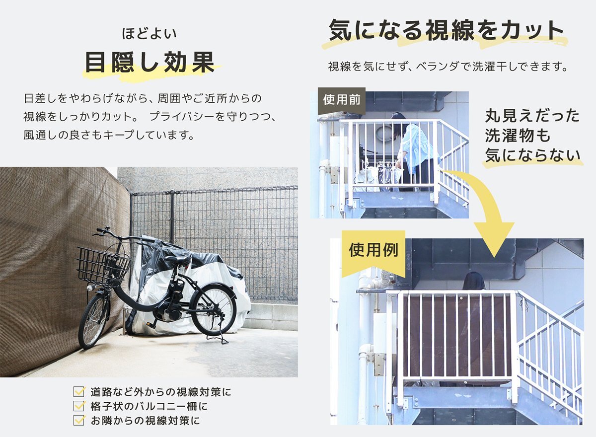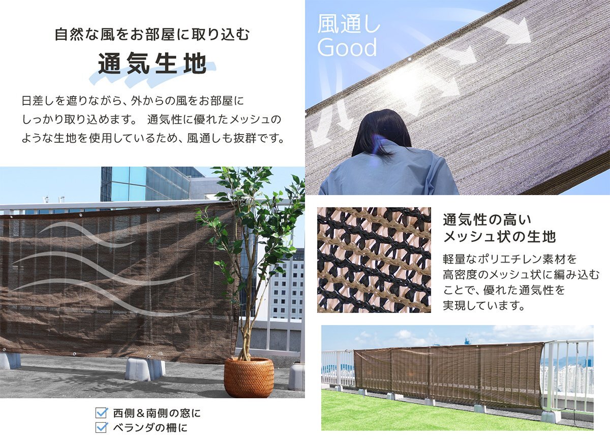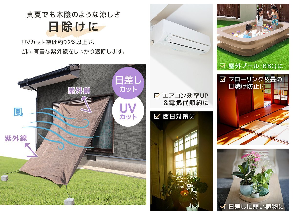 直射日光を和らげる! 暑さ対策と目隠しにも最適な日除けシェードです。 ■風通しのいい通気タイプで快適 UVカット率92%以上&遮光率90%以上! 日差しをしっかりカット!室温上昇を抑制し、 通気性のある素材が風を通すので、快適に過ごすことができます。 ■目隠しにも最適 外からの気になる視線も遮り、プライバシーを守ります。 ■錆びにくいアルミ製のハトメ ハトメを多めに使用しているので、しっかり固定できて安全です。 縦にも横にも使えてピンっと張れます! ■軽量タイプで取り付け簡単 付属の紐や結束バンドを穴に通して固定するだけなので、取り付けも簡単♪ 商品コード:HYS01MOB ■商品仕様 カラー:モカ 材質:HDPE サイズ(約):100×500cm UVカット率:92.3% 遮光率:90.3% ■付属品 ロープ(約160cm)×4本 結束バンド ■保障期間 30日間 ※商品到着後30日以内の初期不良・破損のみご対応させていただきます。 ■注意事項 ※商品は、モニターによって色合いが異なって見える場合があります。 ※仕様・デザインは改良のため予告なく変更することがあります。 【もちろん新品未使用品です】 |