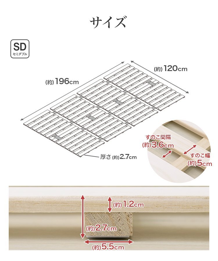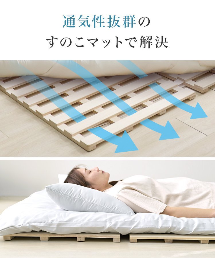 すのこマットで湿気対策! 通気性抜群で湿気を抑制します。 風を通しやすい極厚2.7cm。 床からの高さを設けることで通気性を高めています。 4つ折りなのでそのまま布団を簡単に室内干しができ、使わない時はコンパクトに収納可能。 軽量設計で持ち運びも楽々。 天然の桐材を使用。抗菌・防虫・防腐効果があります。 桐は、断熱性と保温性に優れ、寝具を床の冷たさから守ります。 安全性を考慮してマットの角には面取り加工が施されています。 さらに床の傷つきを防ぐためのクッション材付き!。 家族みんなで安心して使えます。 【商品仕様】 タイプ:セミダブル カラー:ナチュラル サイズ:(約)幅120×奥行き196×高さ2.7cm 重量:(約)5.5kg 素材:天然木(桐材)、EVA 他 【注意事項】 ・すのこの上に立つ場合はさん木の上に足をかけるなど強度の弱い部分に体重がかからないようにご注意ください。 ・飛び跳ねたり、一点に荷重をかけたりすると割れる恐れがあります。 ・製造時期によっては若干色味が異なる場合があります。 ・商品は、モニターによって色合いが異なって見える場合があります。 ・仕様・デザインは改良のため予告なく変更することがあります。 |