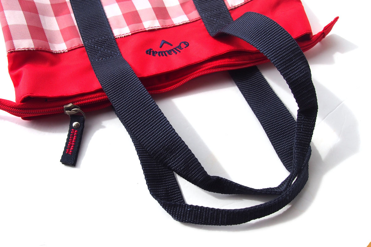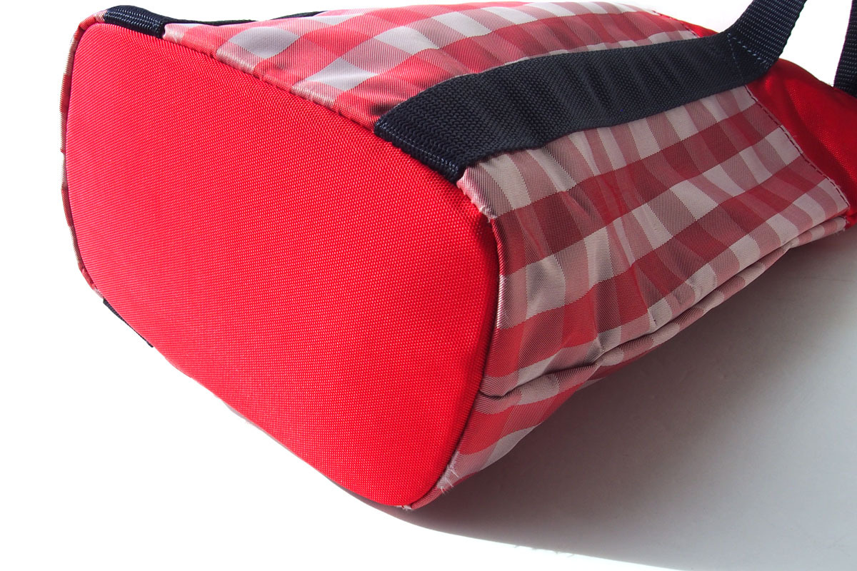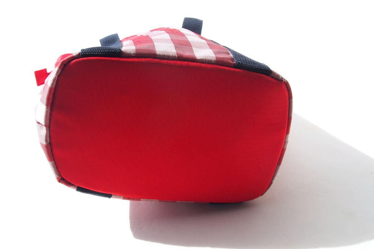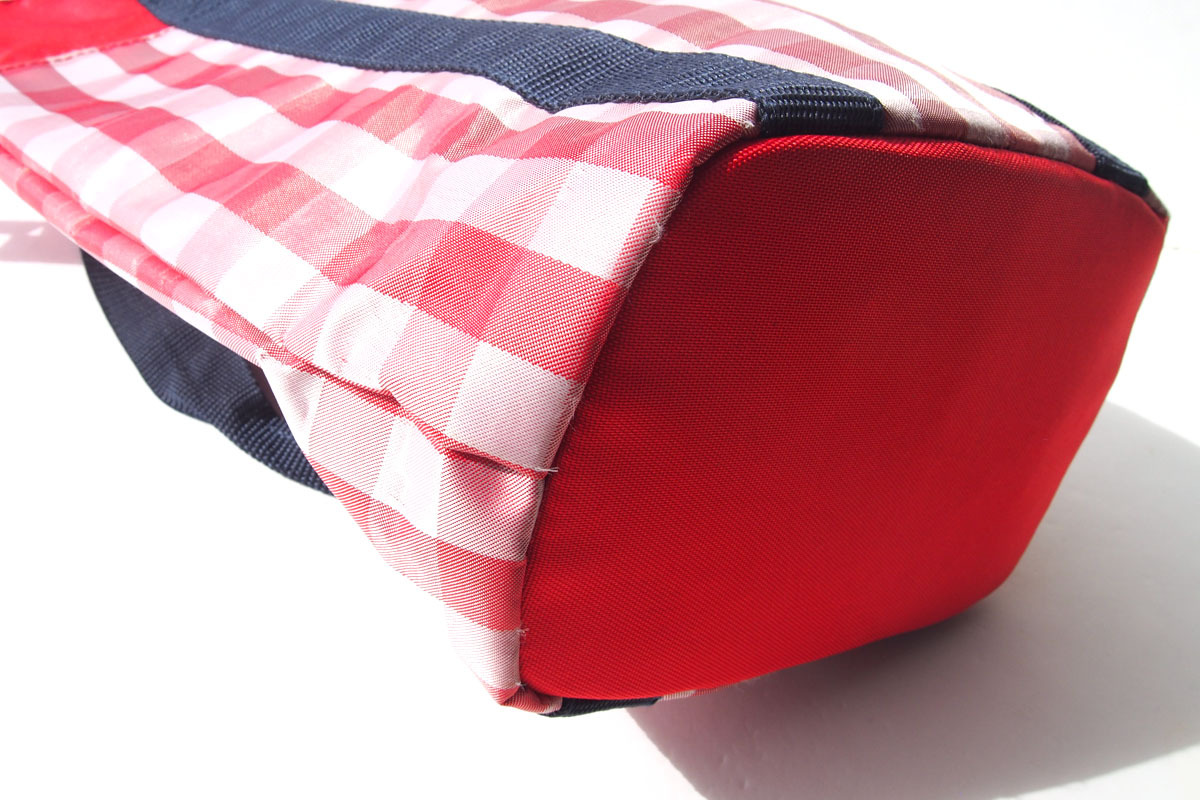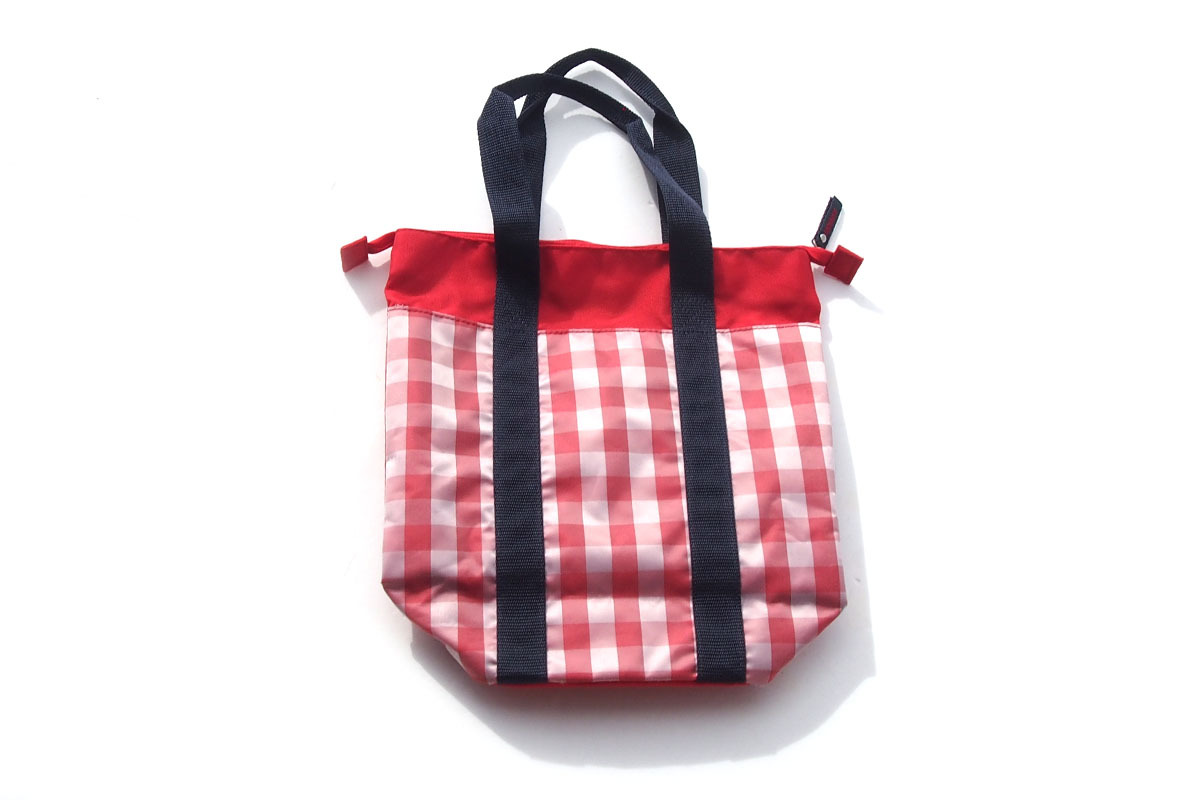 レッド×ホワイトのチェックにブラックの持ち手が映え、スポーティな中にも遊び心を感じるデザイン。
