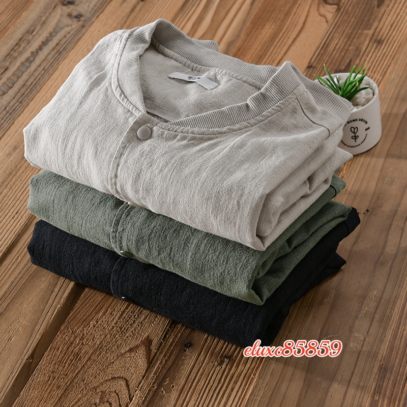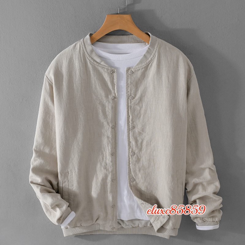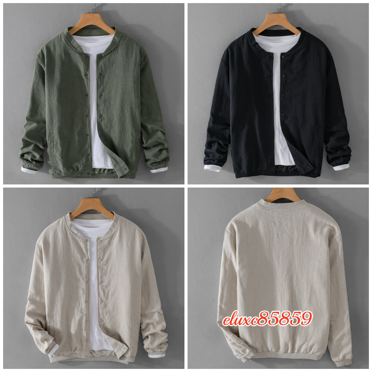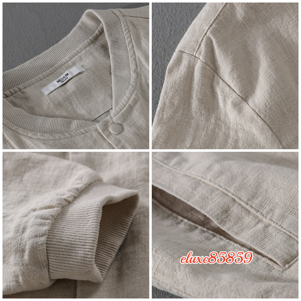 秋新品 メンズ 麻 ジャケット 立ち襟 無地 カジュアルジャケット 綿麻 ジャンパー ブルゾン 紳士 通勤 アウター サイズ選択可M カーキ