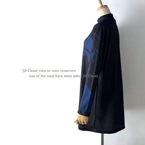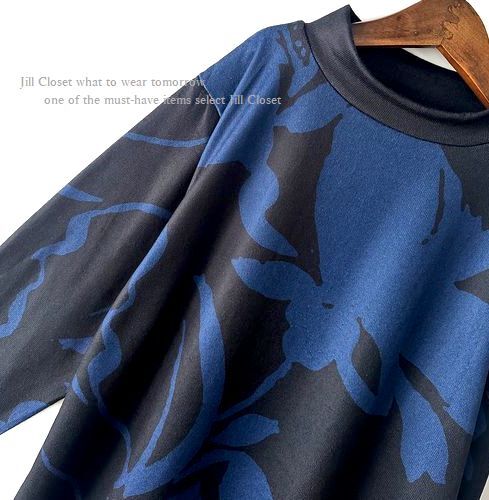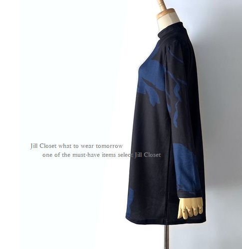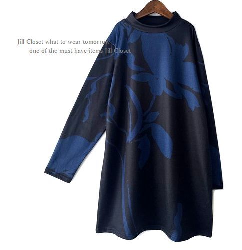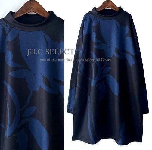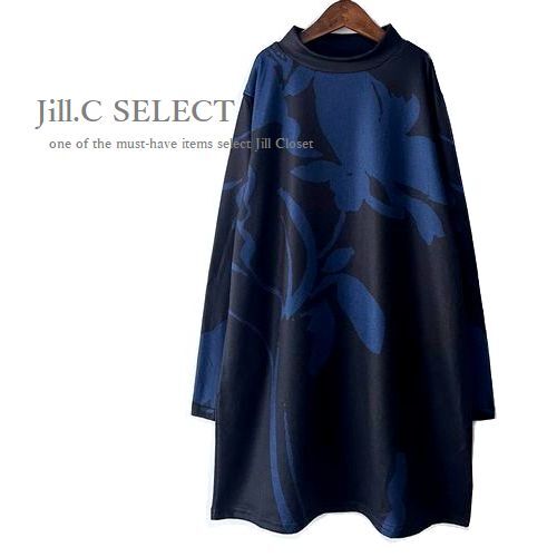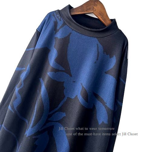 ブラックベースにフラワーシルエットプリントが素敵な薄手よりのニットソーストレッチ素材。着こなしでロングシーズン大活用頂けます。カーディガンやアウターのインナーにも最適。人気のハイネックデザイン。ほぼIラインでストンと着られてすっきり着やせ効果◎気になるスタイルもすっぽりカバー出来ます。デイリーにお出かけに大活用いただけます♪