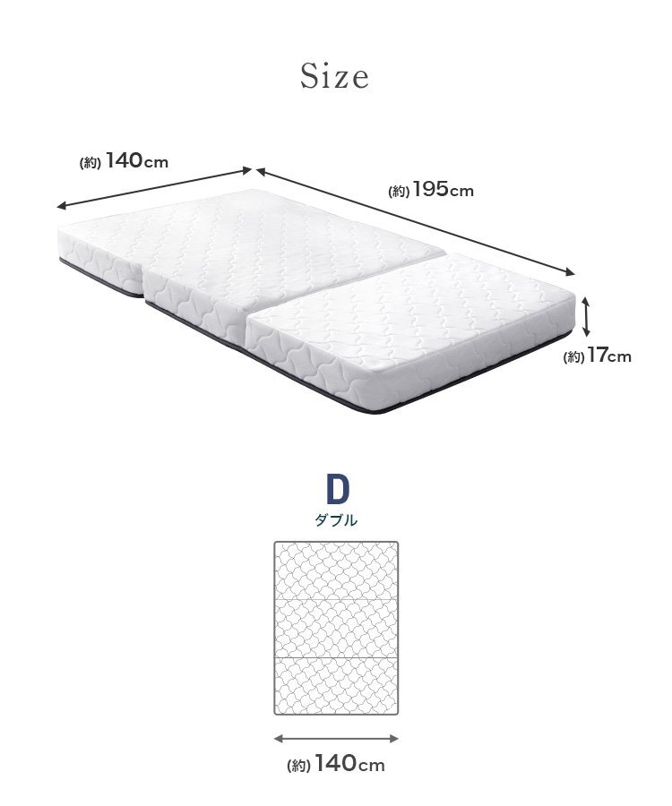 収納しやすく、お手入れに便利な 3つ折り タイプ! 厚みたっぷり17cm!床置き でも使える底付き感のない寝心地。 ボンネルタイプのマットレスは、硬めのスプリングが特長で、程よい反発、張りのある感触です。 多重構造で硬すぎず、やわらか過ぎない安定感とクッション性で身体をしっかり支えるマットレスです。 ボンネルコイルが、身体を面で支え、就寝時の身体の一部分(首・肩・腰・足)にかかる体圧も分散。 肩や腰の沈み込みを防ぎ、安定感のある寝心地です。 高密度30Dのウレタンを使用しているので、へたりにくく、長時間寝ている間もしっかり支えます。 ボンネルコイルは通気性抜群! 暑がりな方や、寝汗など、湿気が気になる方にもオススメです。 三つ折りマットレス は、サッと コンパクト に折りたためるので 押入れなど、省スペースに収納しやすく、持ち運び にも便利! ワンルーム など狭いお部屋にも最適です。 立て掛けておいても場所をとらないので、湿気対策に! ロール状に梱包した圧縮パッケージだから、お届け時も省スペースで、玄関先での受け取りもラクラク。 開封後すぐにご使用いただけます。 ※本来の大きさを取り戻すのに2-3日かかる場合があります。 体格の良い方、仰向け寝やうつぶせ寝が多い方にもオススメです。 敷き布団、ベッドマットレス、来客用 マットレス にもオススメ◎ 【商品仕様】 こちらはダブルサイズ・ブラックのカラーの商品ページとなります サイズ:(約)幅140cm×長さ195cm×厚み17cm 重量:(約)24㎏ コイル数:480個 線径:2.2mm 素材:ボンネルコイル、高密度ウレタン(密度30D)、ハードフェルト、パイル生地 他 【注意事項】 ・圧縮梱包されたままの状態で長期間保管した場合、マットレスが復元できなくなってしまいます。 商品到着後、すぐ圧縮から開放をして頂くようにお願いいたします。 ・マットレスは約2-3日で復元します。気温や温度により3-14日かかる場合もあります。 ・製品の臭いが気になりましたら、風通しの良いところで脱臭してください。 この臭いは素材のウレタンによるもので無害です。臭いに敏感な方は十分ご検討の上、ご購入をお願いいたします。 ・マットの硬さは温度によって変わってきます。また、硬さの感じ方には個人差があります。 ・生産ロットによって復元率・ニュートンに差異が生じる場合があります。 ・商品は、モニターによって色合いが異なって見える場合があります。 ・仕様・デザインは改良のため予告なく変更することがあります。 |