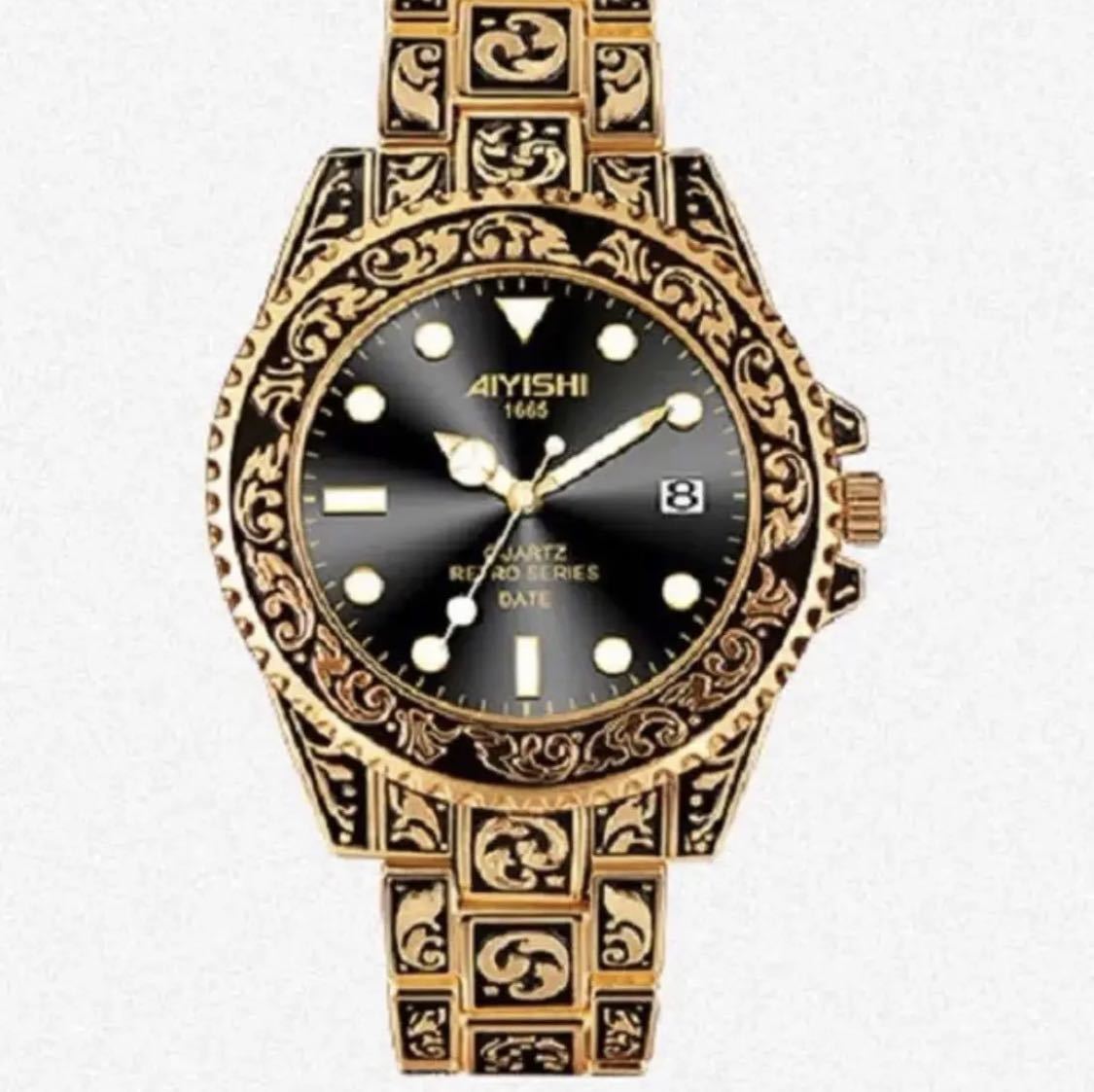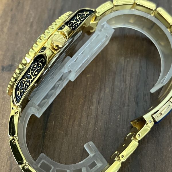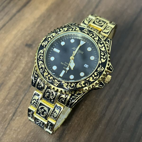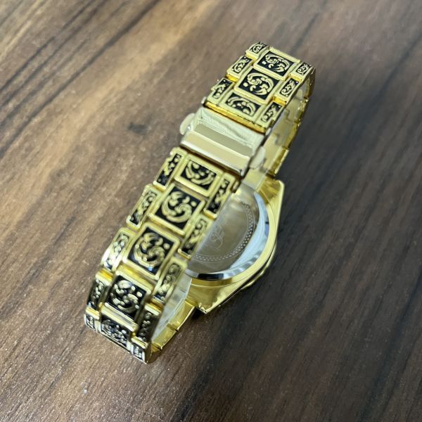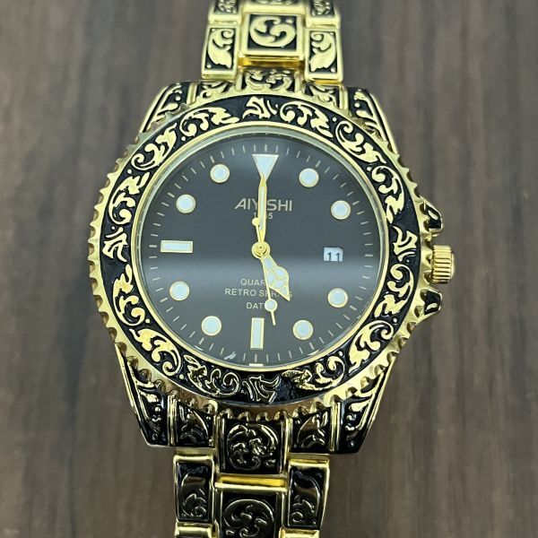 メンズアンティーク腕時計 総柄 クォーツ ゴールド×ブラック