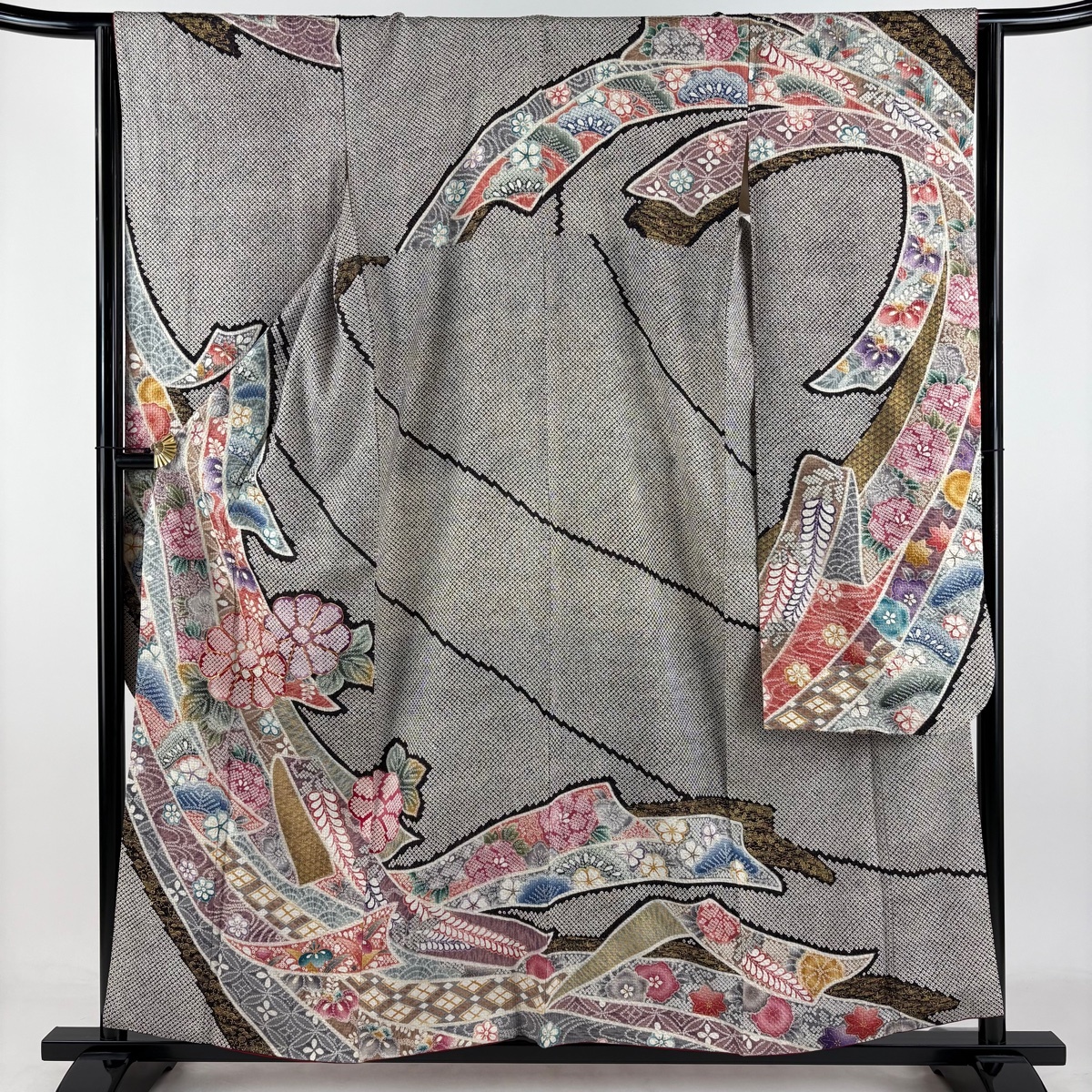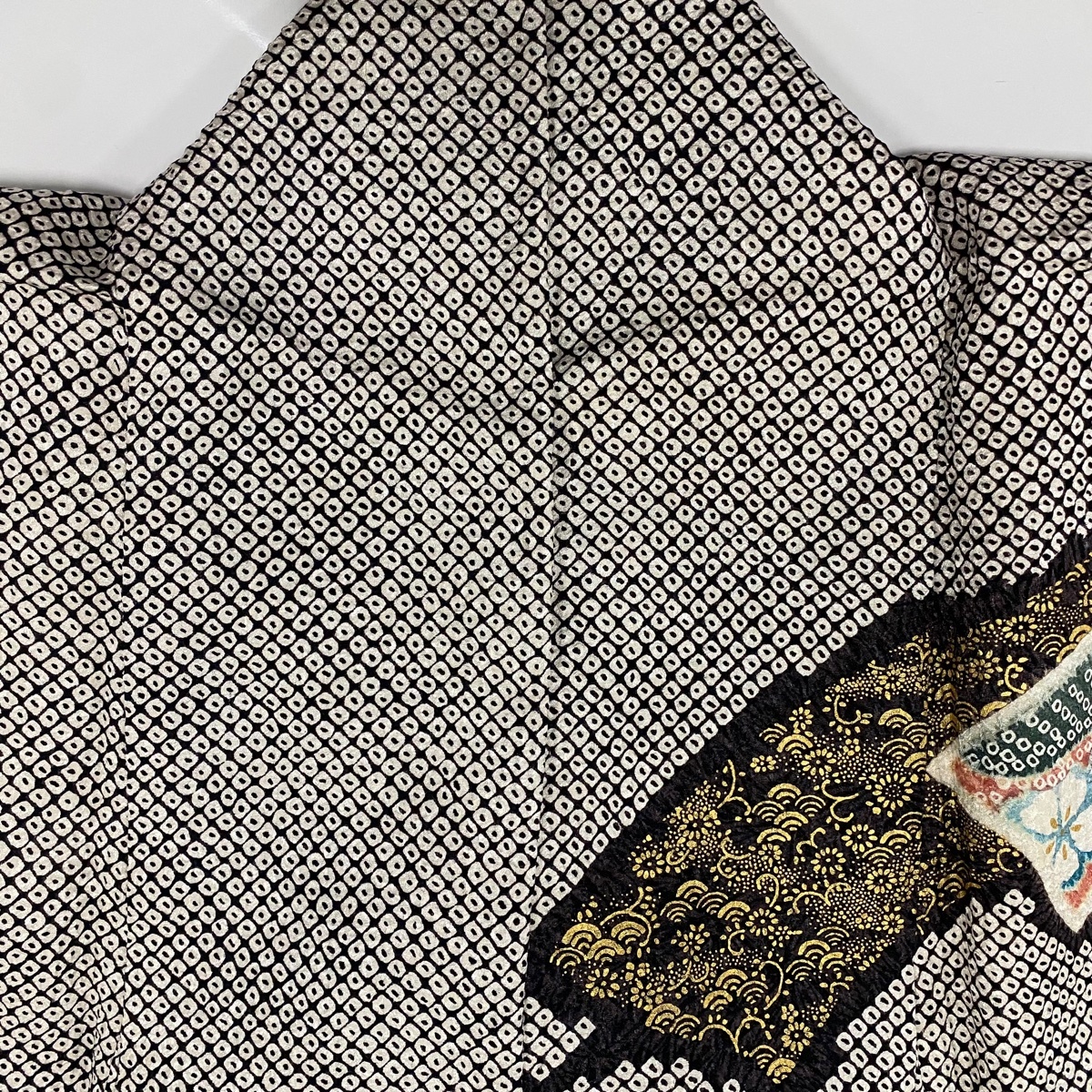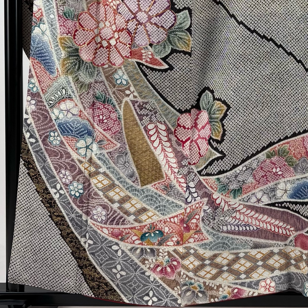 | 振袖 美品 名品 草花 熨斗 金彩 絞り 黒 袷 身丈158 裄丈63.5 S 正絹 【中古】 |