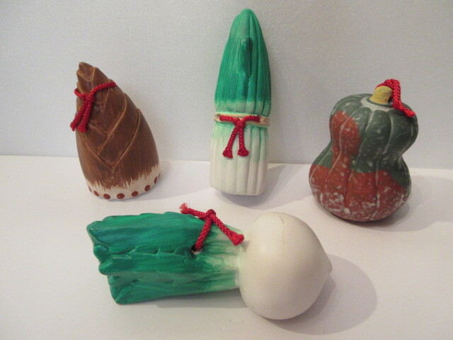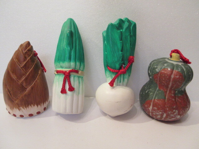 【壽】廃絶 京野菜土鈴(大)4個組 土人形 郷土玩具 鹿ケ谷南瓜 聖護院大根 九条葱 京筍 民芸品