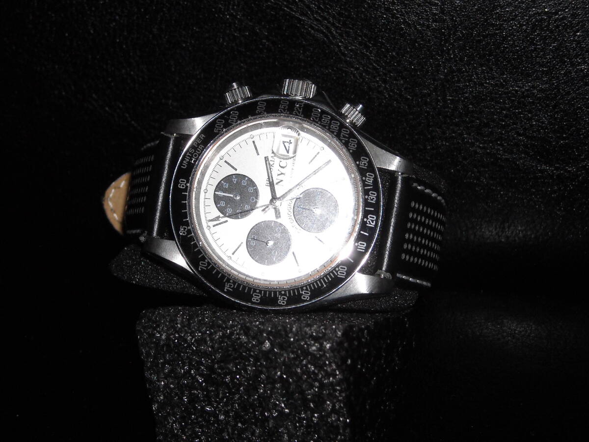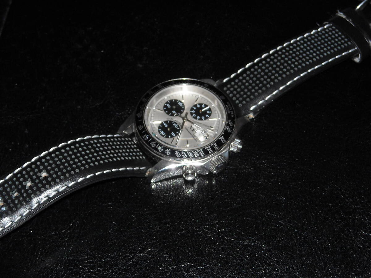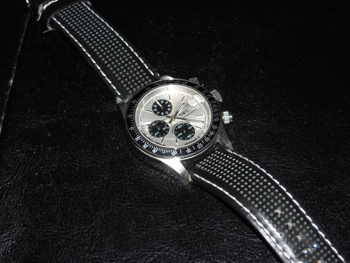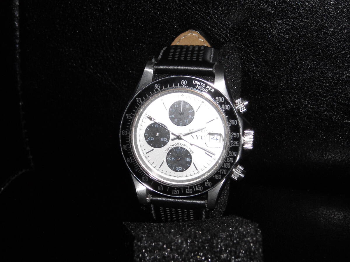 ブルッキアーナ白文字盤x黒窓のオシャレなデザイン、チューダー風のクロノグラフウォッチです。