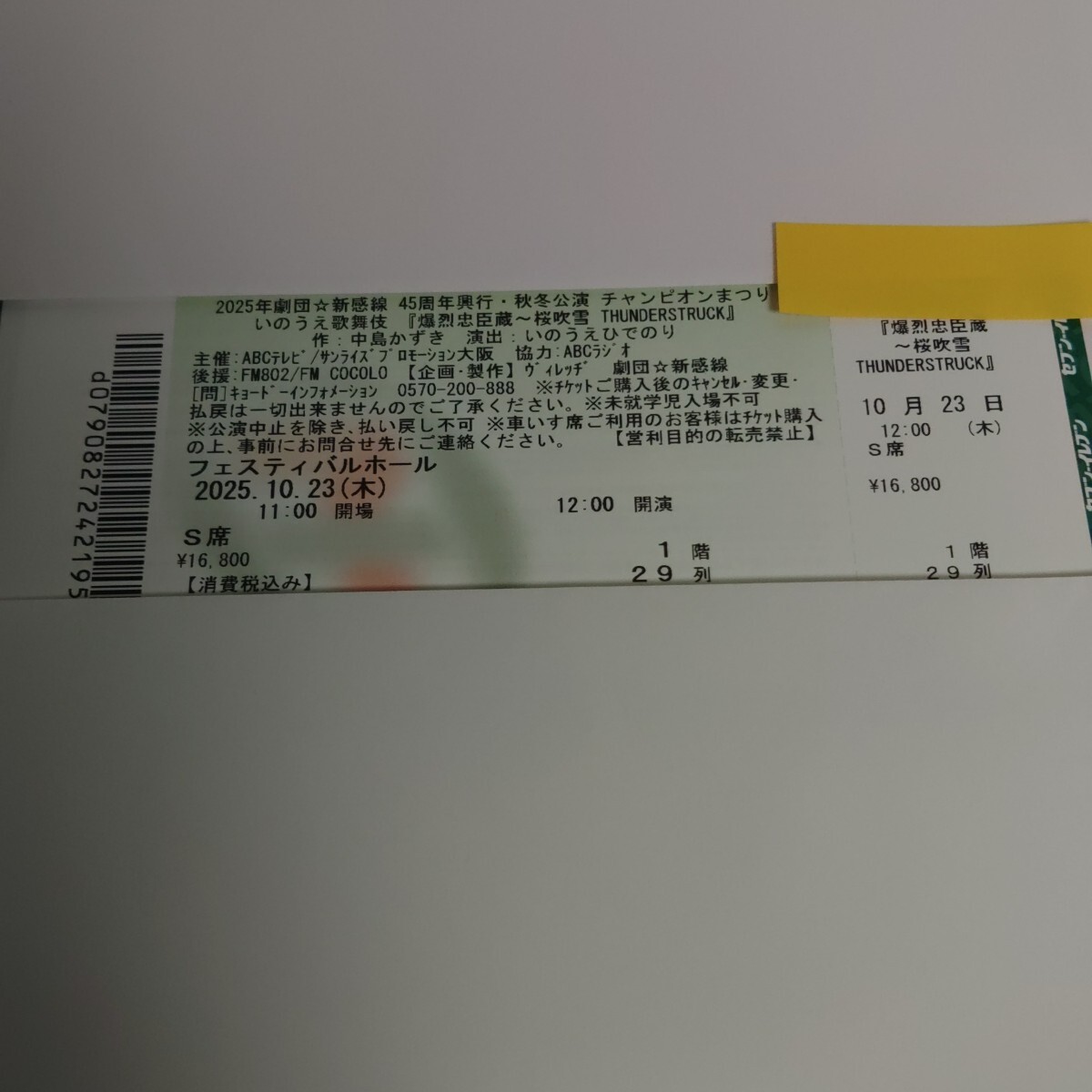 12:00開演 「爆烈忠臣蔵」 1階 29列 30-50番台 1枚