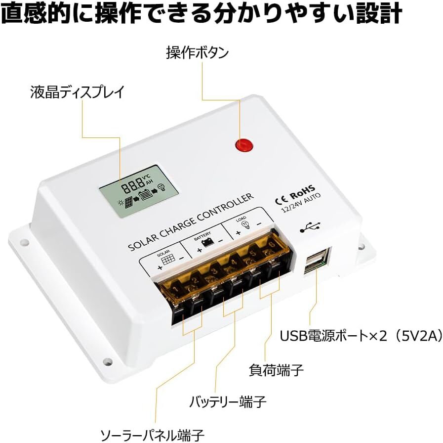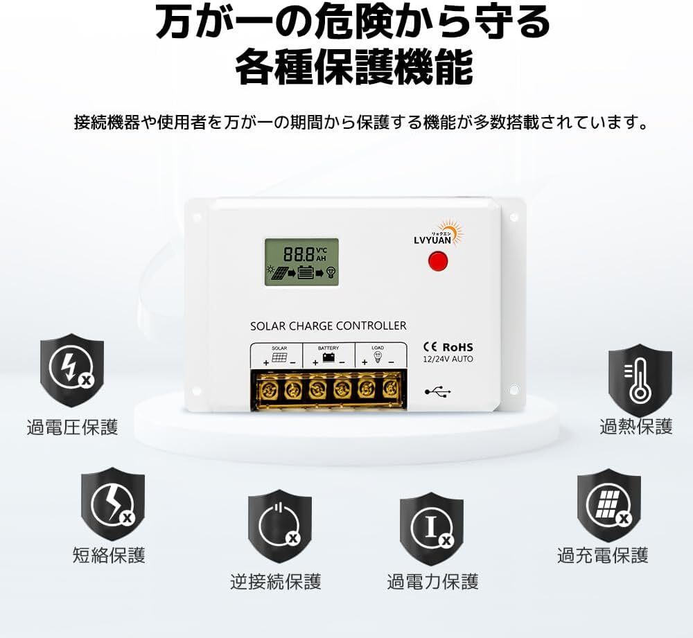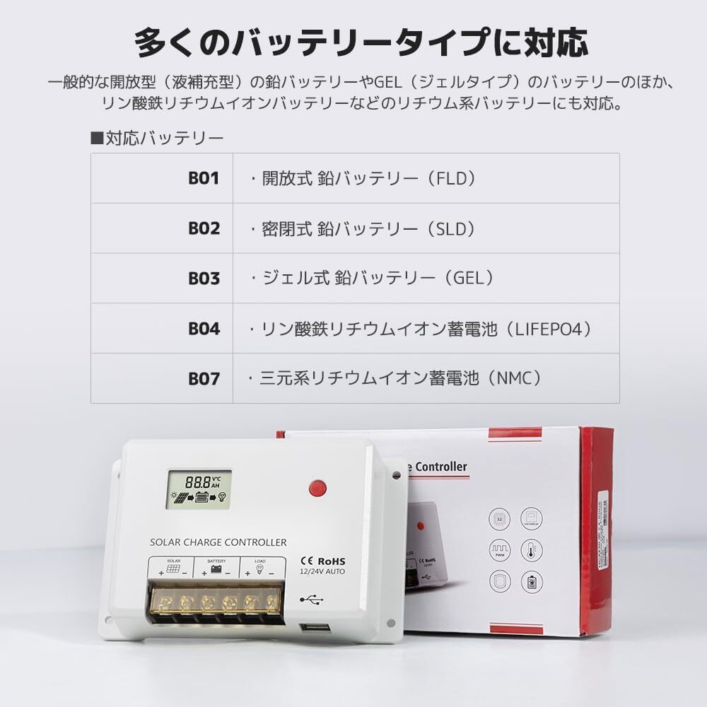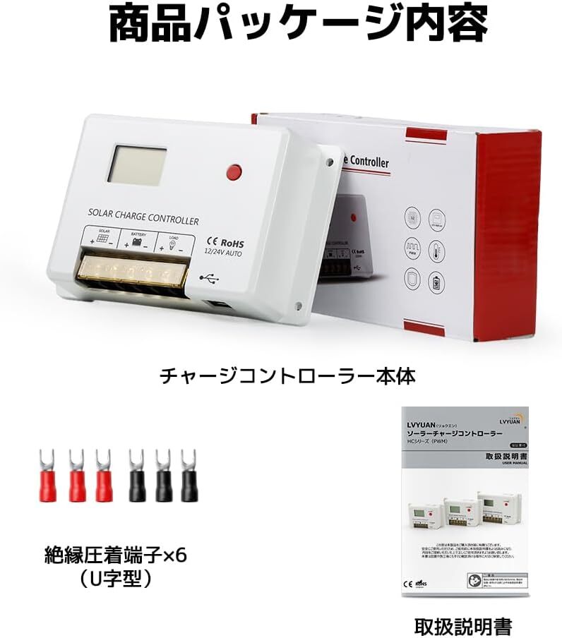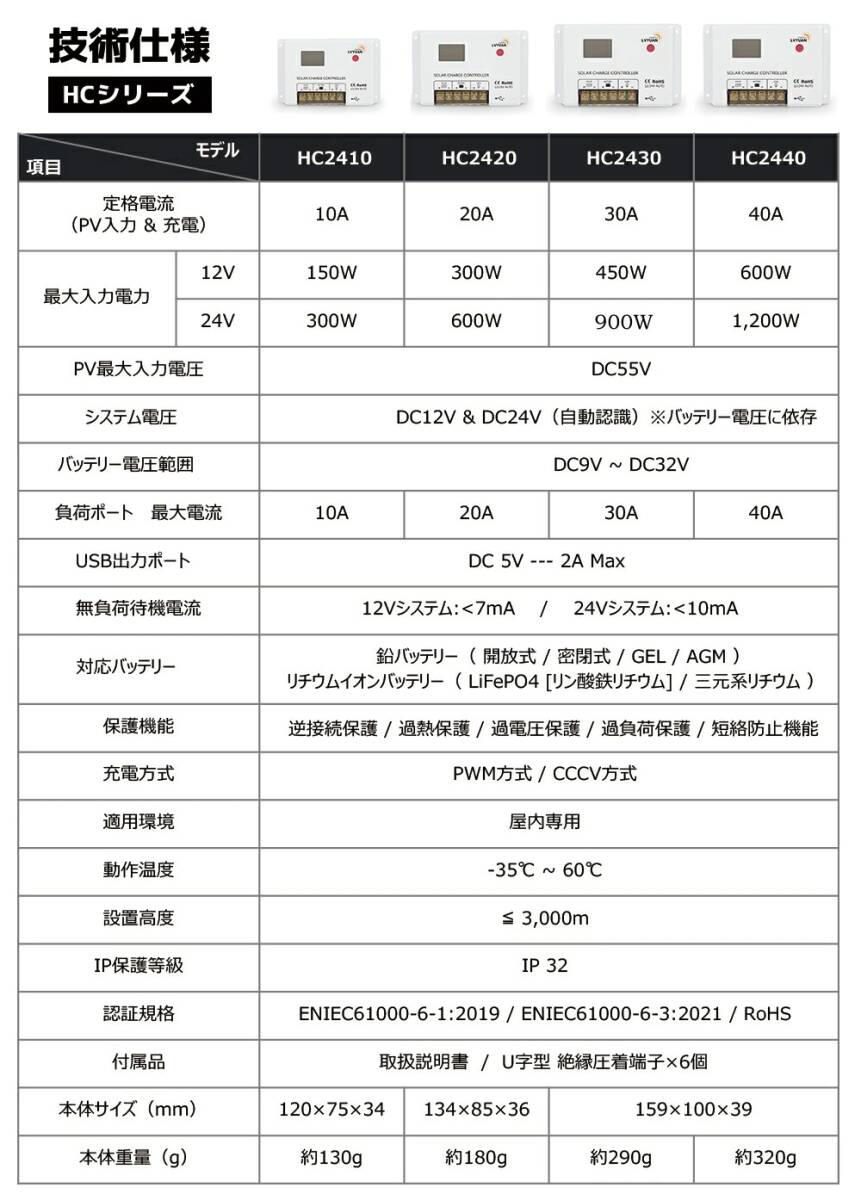PWMチャージコントローラー **HCシリーズ** は、信頼性の高いPWM充電方式を採用し、ソーラーシステムの効率的な運用をサポートします。日本語説明書付きで安 心して使用可能です。