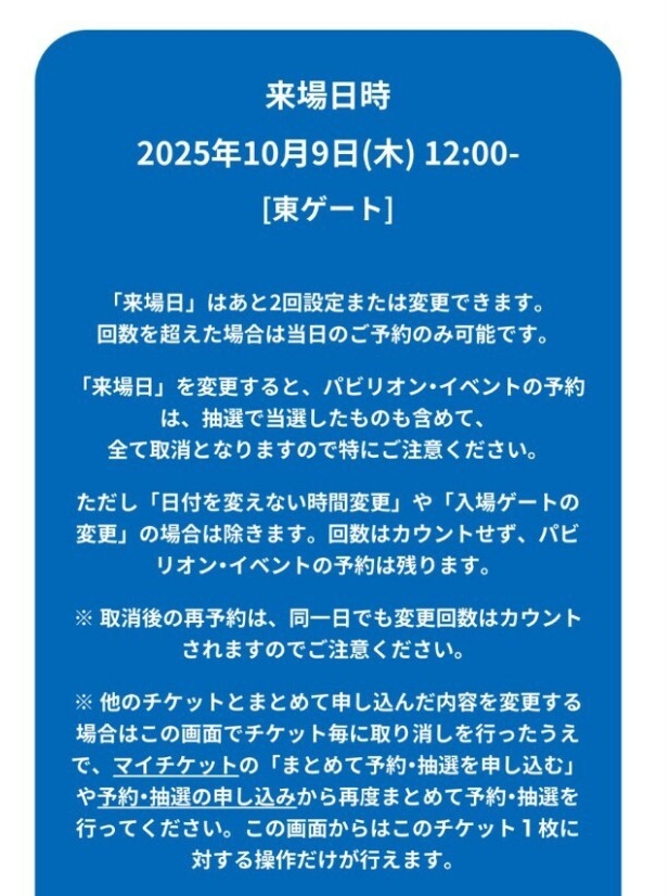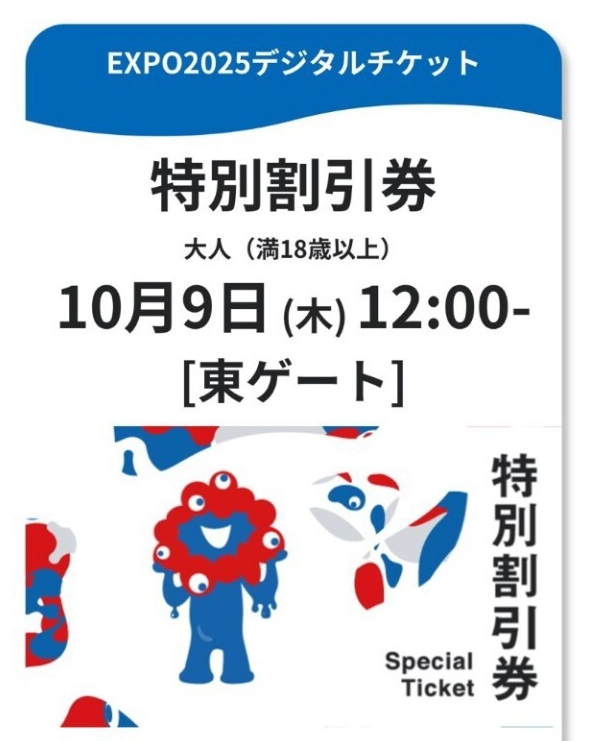 2025大阪・関西万博の10月9日(木)12時台 東ゲート入場の予約済みチケット(特別割引券)の1枚です。