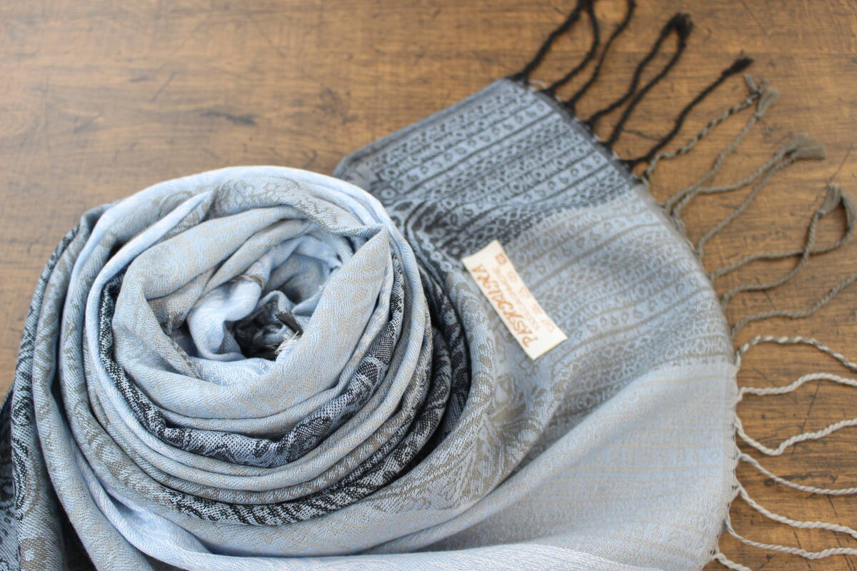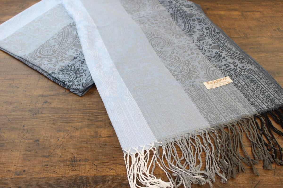 新品【パシュミナ Pashmina】ペイズリー柄 ライトブルー系グラデーション 青 L.BLUE 大判 ストール カシミア100% Cashmere 訳あり
