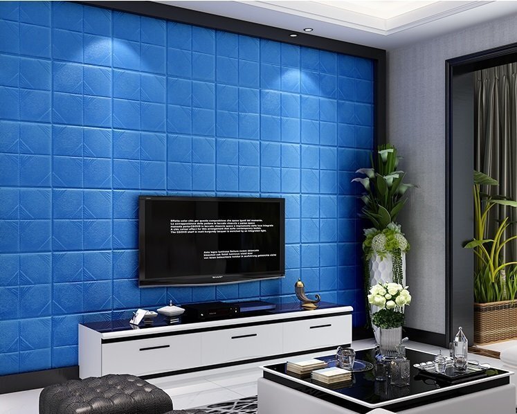 【50枚】高品質 3D クッション 壁 シール デザインスクエア×ブルー レザー タイル調 糊付き リメイク 60×60cm 耐水 抗菌 傷防止