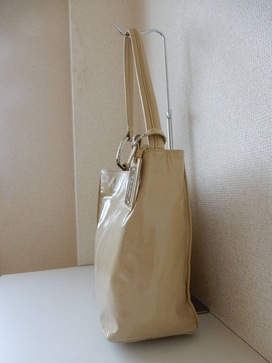 ロゴチャームがアクセントとなったエナメルショルダーバッグ。