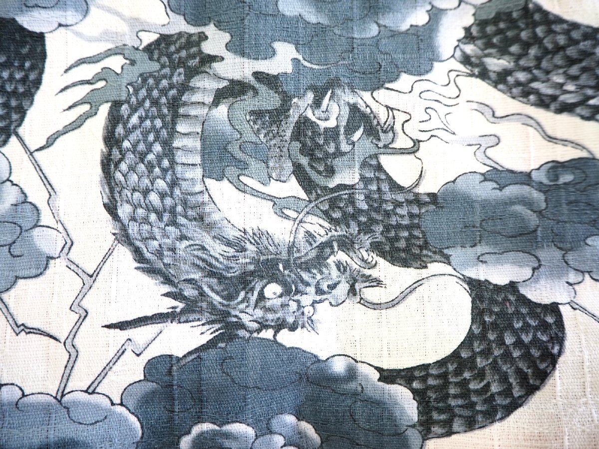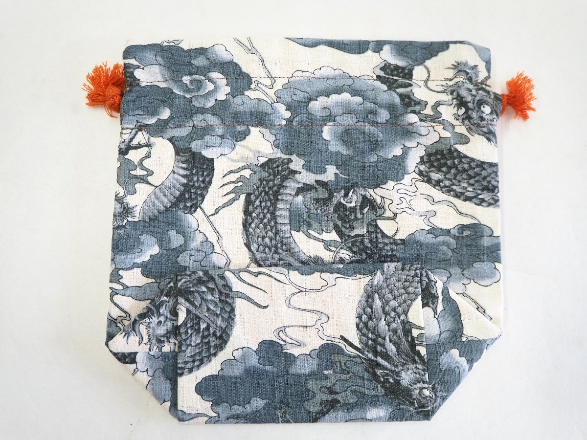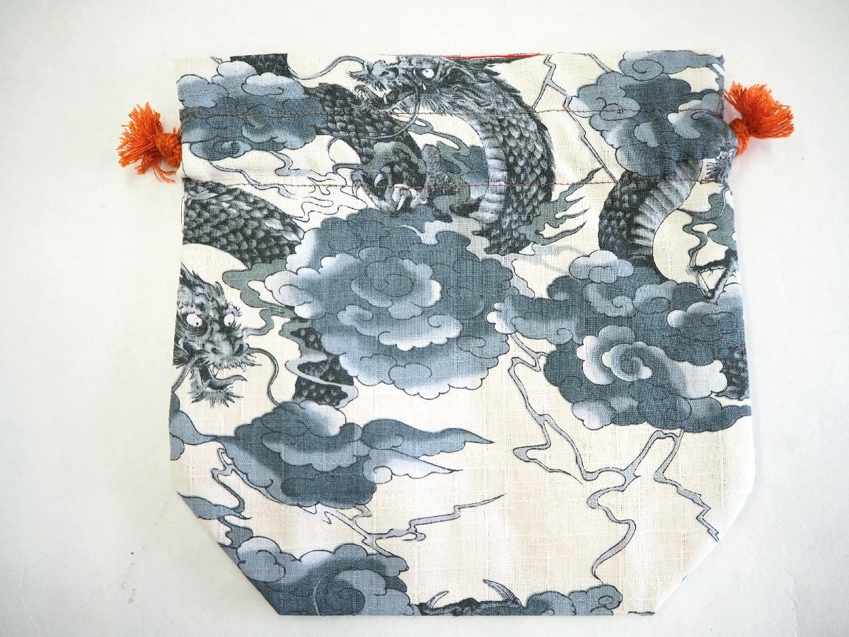 ★☆ ハンドメイド【 巾着 和柄 裏付 マチ有り(表:雲龍柄、裏:赤色) 】手作り 小物入 ポーチ ☆★