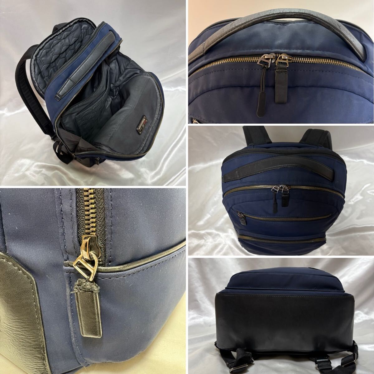 外側は持ち手に擦れなどの使用感、底部角付近に擦れ剥がれ、ファスナーの引き手が1つ欠損(社外品を取付け済)、フロントポケットのファスナータブも取れかかっています。