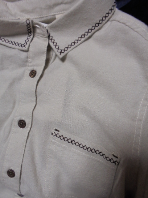 衿部分、胸ポケット口に焦げ茶色のクロスステッチ