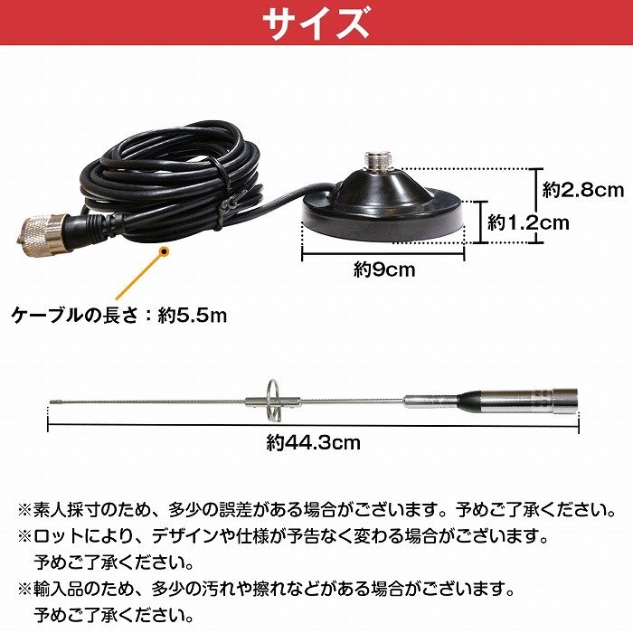 商 品 説 明モービル用 アンテナ&マグネット基台&同軸ケーブル 5m の3点セットになります。