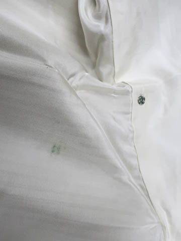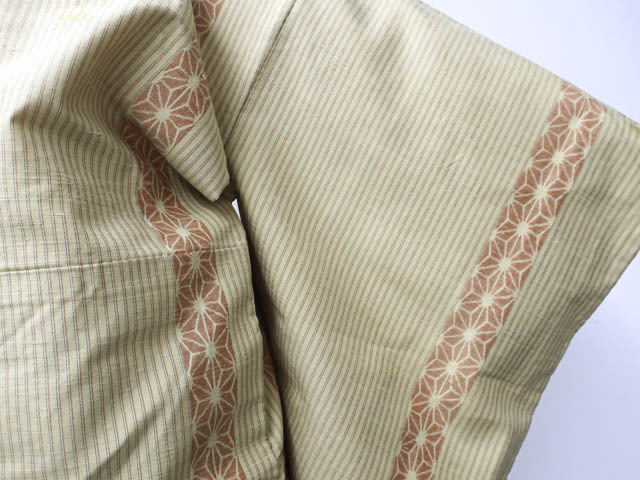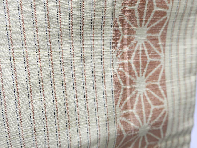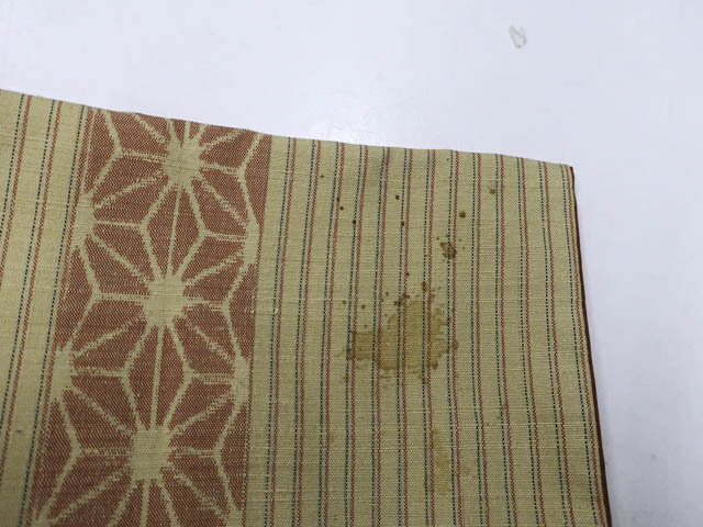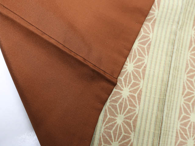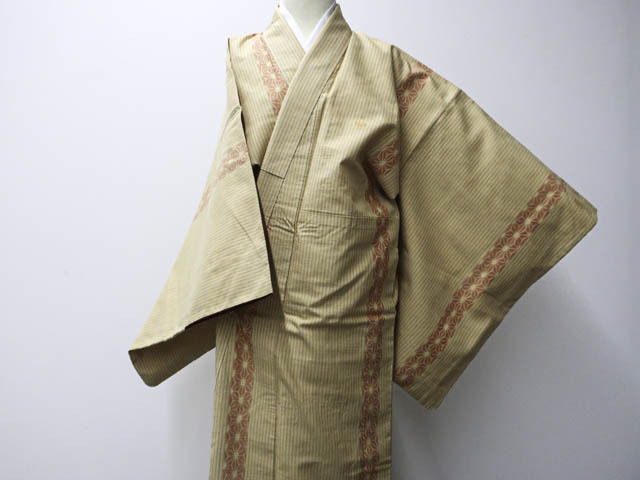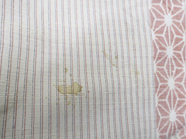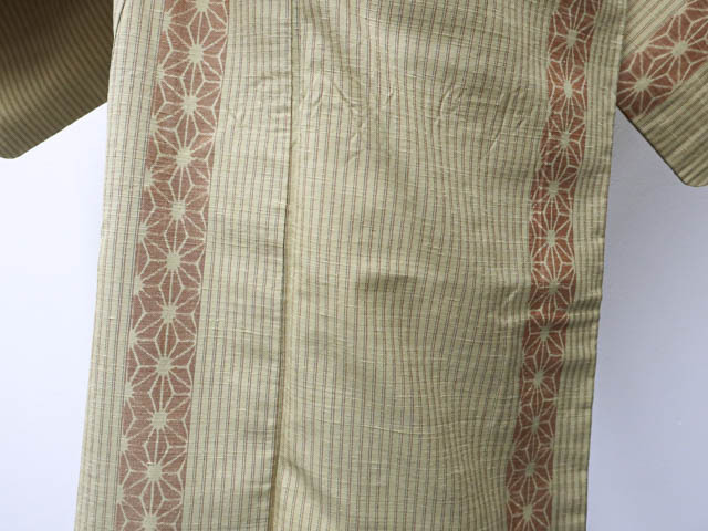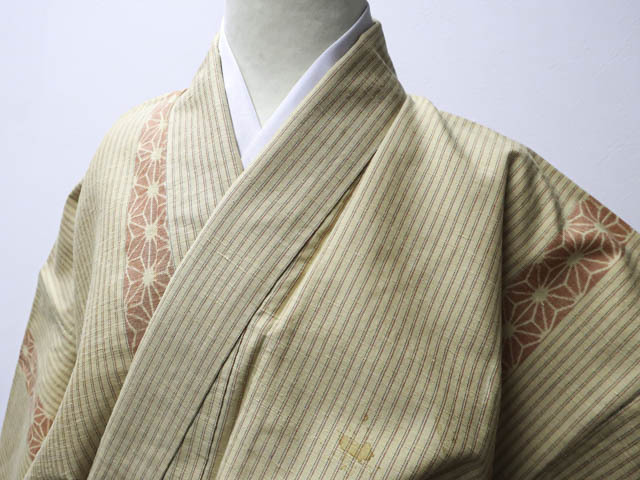 リサイクル商品のため、左胸・左前袖に汚れ、胴裏にシミとスナップボタン汚れ、前後身頃に点汚れがございますがご着用いただけると存じます。 地色は薄黄土です。 1枚目の画像が近いお色かと思われます。 素材は正絹です。 |