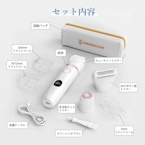 【3-in-1多機能ヘッドで全身対応】 全身電動シェーバーはボディシェーバー・VIOシェーバー・フェイスシェーバーを簡単に付け替え可能です。部位に合わせて使い分けられます。①3Dボディ用トリマー(3~12mm調整式コーム付き、航空機材級鋼製ブレードで全身に使用可)、②ビューティートリマー(セラミック丸角設計でVIO・ワキに最適)、③まる型ネットトリマー(チタンコーティングで0.5mm精密カット、指や顔などのうぶ毛やvioゾーンの剃り残しに適用)。MAXGROOMシェーバーは顔のうぶ毛、脇・腕・指毛、脚・すね毛、さらにVIOやデリケートゾーンのアンダーヘアまで、男女問わずに広範囲から細部までムダ毛を簡単・スピーディーにに処理できます。