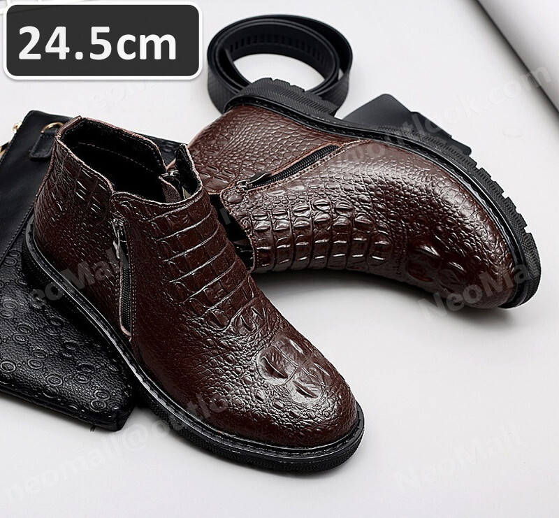 ワニ柄 型押し 牛革 メンズ シュートブーツ ブラウン サイズ 24.5cm サイドジッパー カジュアル 屈曲性 通勤 軽量 インポート品【n025】