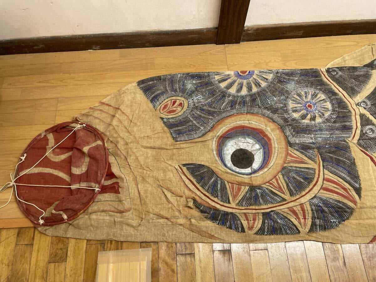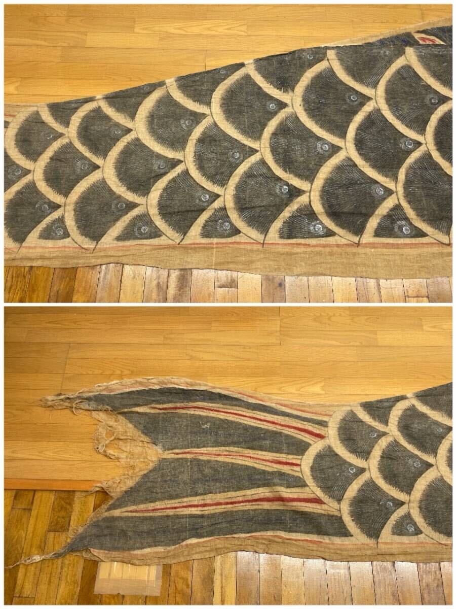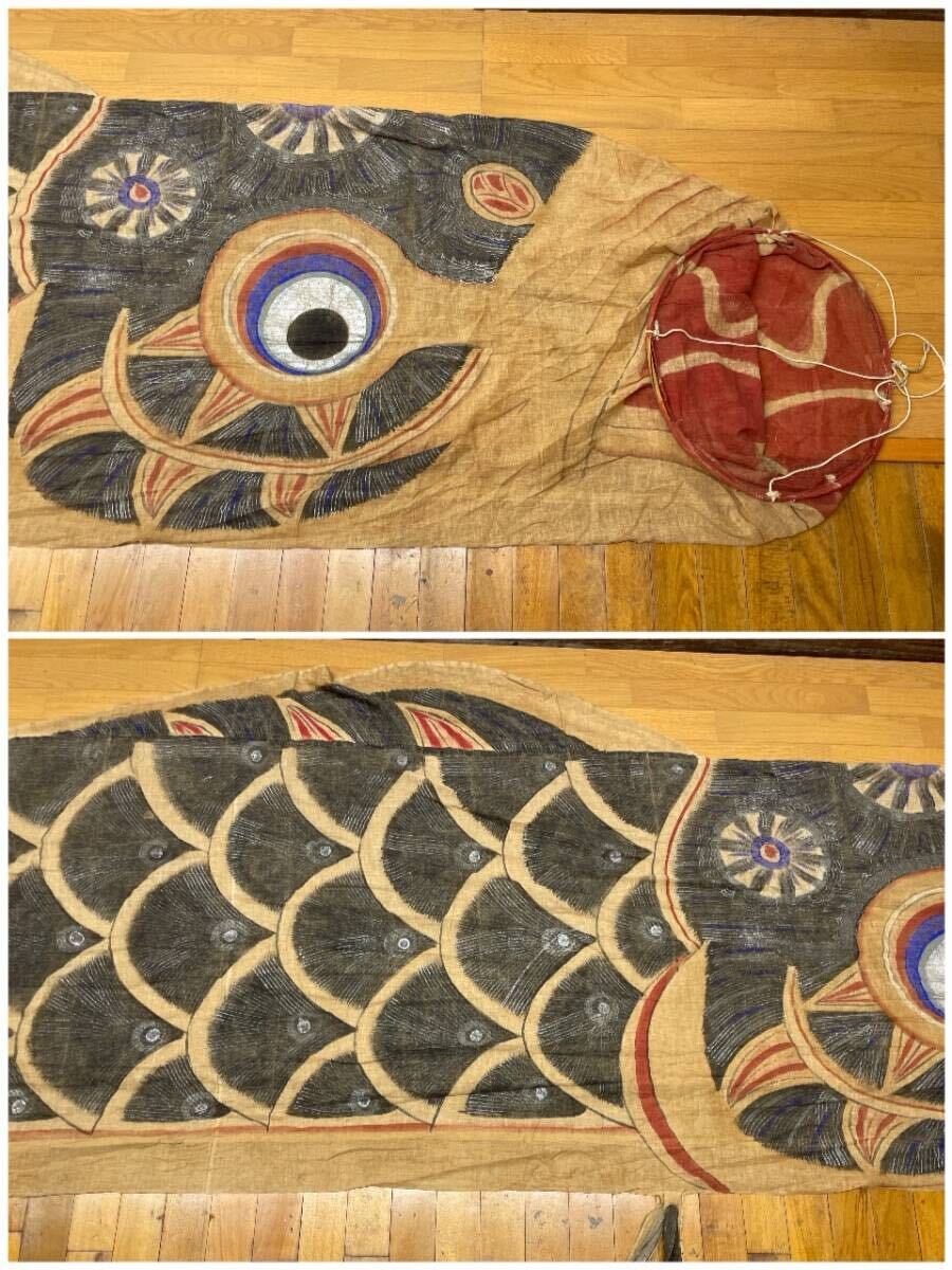 古い鯉のぼり① 真鯉(全長520cm) 黒 手描き 鯉幡 木綿 古布 染め物 リメイク素材