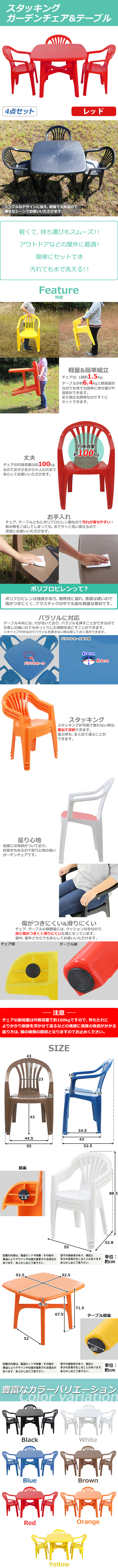 ●ガーデンチェアは、スタッキング構造なので重ねる事が可能なので、収納やまとめて運ぶ際にも大変便利です。 ●テーブル中央にパラソルなど、設置可能な穴があります。 ●テーブルは、簡単な組み立て式になります。チェアは、完成品です。 ●チェアは1脚約1.5kg、テーブルは約6.4kgと軽量なので、女性でも軽々持ち運べます。 ●材質は、軽量、安全、防水のポリプロピレン(PP)です。 注意! 背もたれによりかかり前脚を浮かせて座るなどの後脚に過度の負担がかかる座り方は脚の破損の原因となりますのでお止めください。 ■重量(チェア):約1.5kg(1脚あたり) ■耐荷重(チェア):約100kg(1脚あたり) ■重量(テーブル):約6.4kg ■耐荷重(テーブル):約100kg ■材質:PP[ポリプロピレン](チェア、テーブル)、ゴム(チェア脚裏)、PVC(テーブル脚裏) ●商品のカラーはレッドとなります。 ●新品商品ではありますが、輸入商品の為、多少の擦り傷などがある場合がございますので、ご納得の上ご購入下さいませ。 ●ご購入後、お客様ご都合によるご返品、ご返金等は一切お受け致しておりません。 ●本商品を使用した際に発生したトラブル、事故につきまして、当社は一切の責任を負いません。ご使用に関しましては、全て自己責任にてお願い致します。 |
