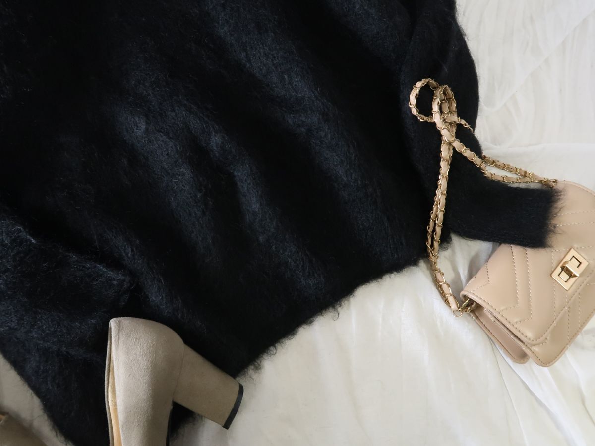 秋冬のムード感を演出する起毛感のある、アシンメトリーデザインのモヘヤニット。