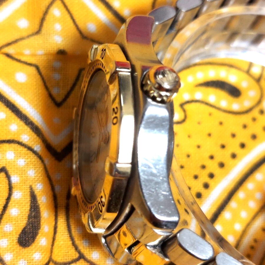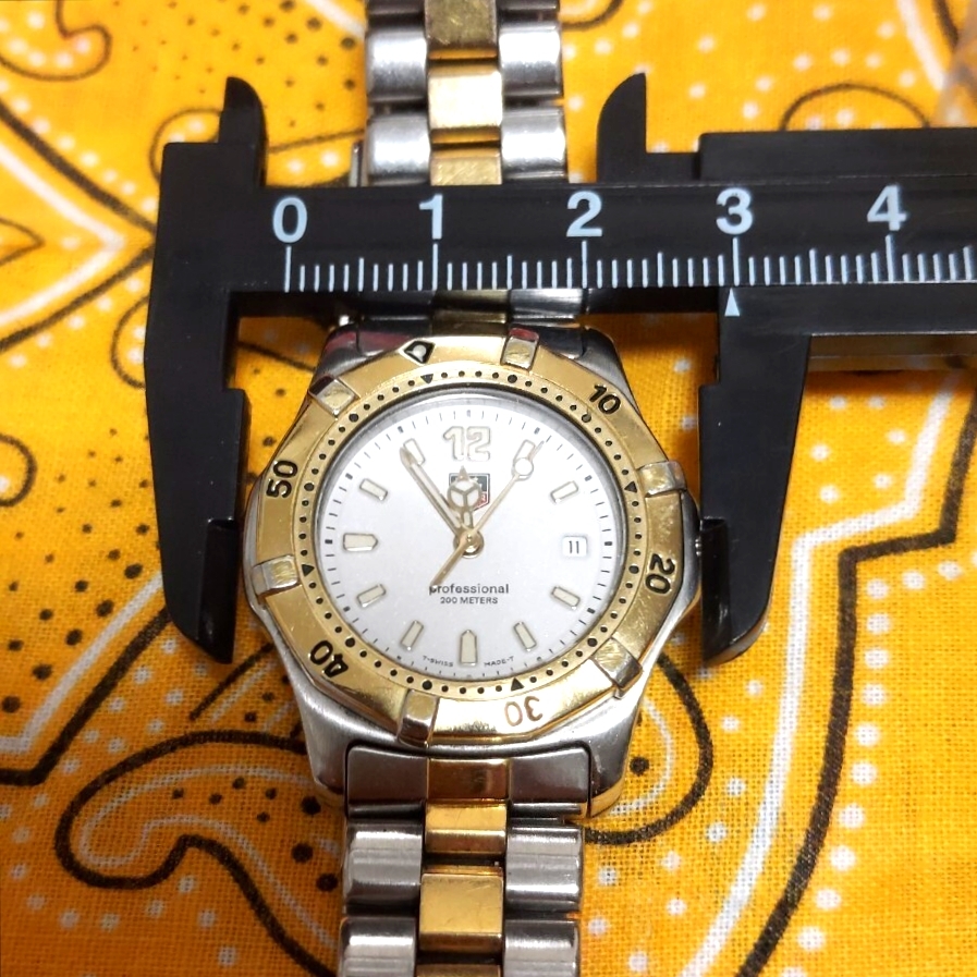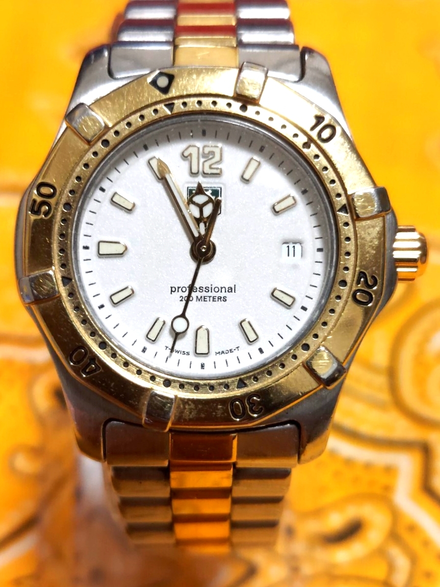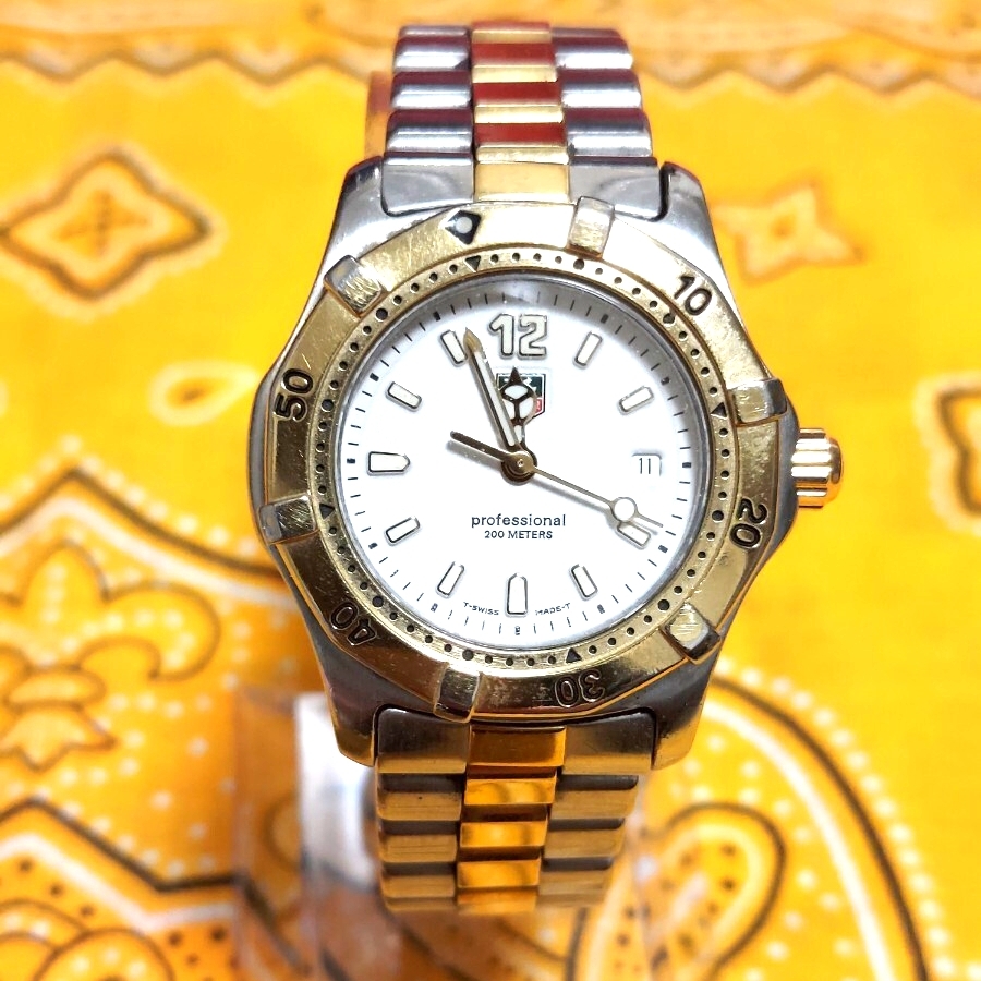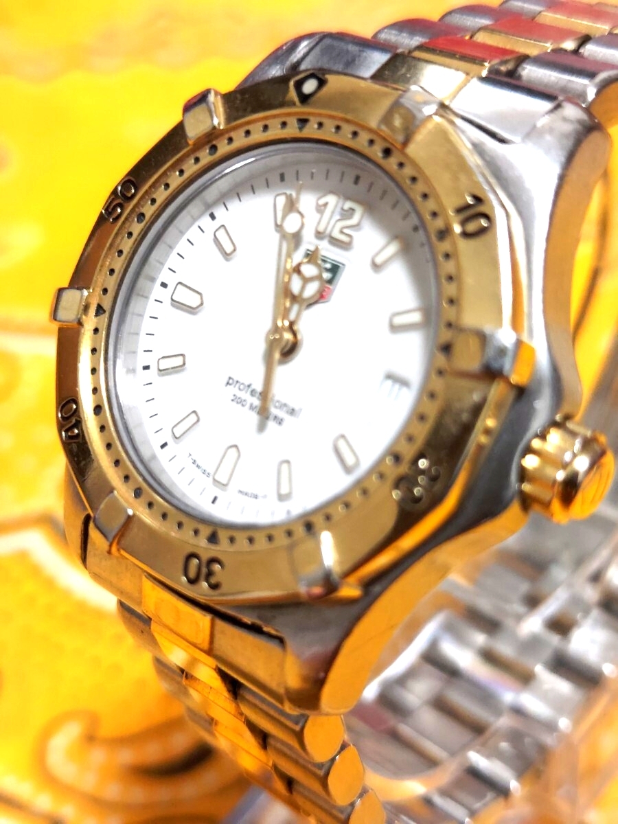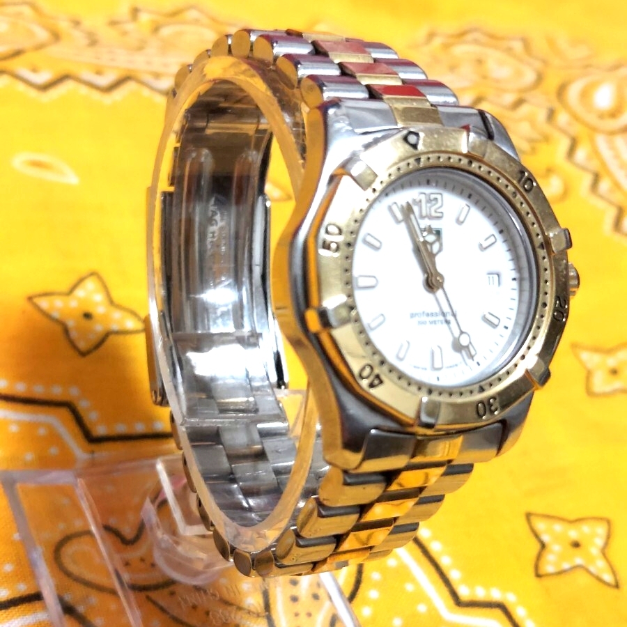 タグホイヤー TAGHEUER Professional 200m WK1320 クォーツ 稼働品です。文字盤ホワイトで、ゴールドのコンビです。腕周りは、17.5~18センチ位です。素人採寸をご了承下さい。