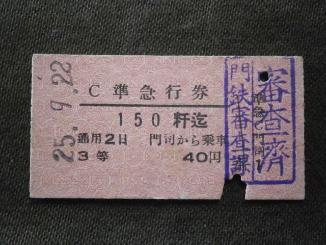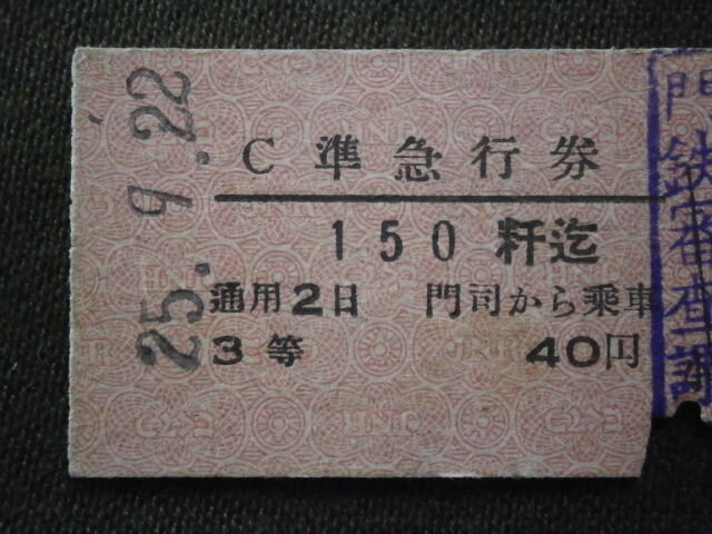 国鉄 3等 門司駅発行 準急行券 門司から150粁迄